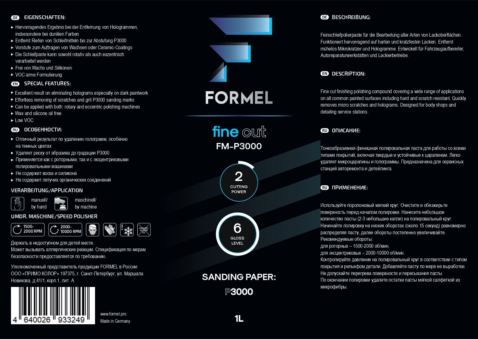 Полировальная паста для авто FORMEL Fine Cut P3000, 1 л / тонкоабразивная финишная паста для кузова информация: