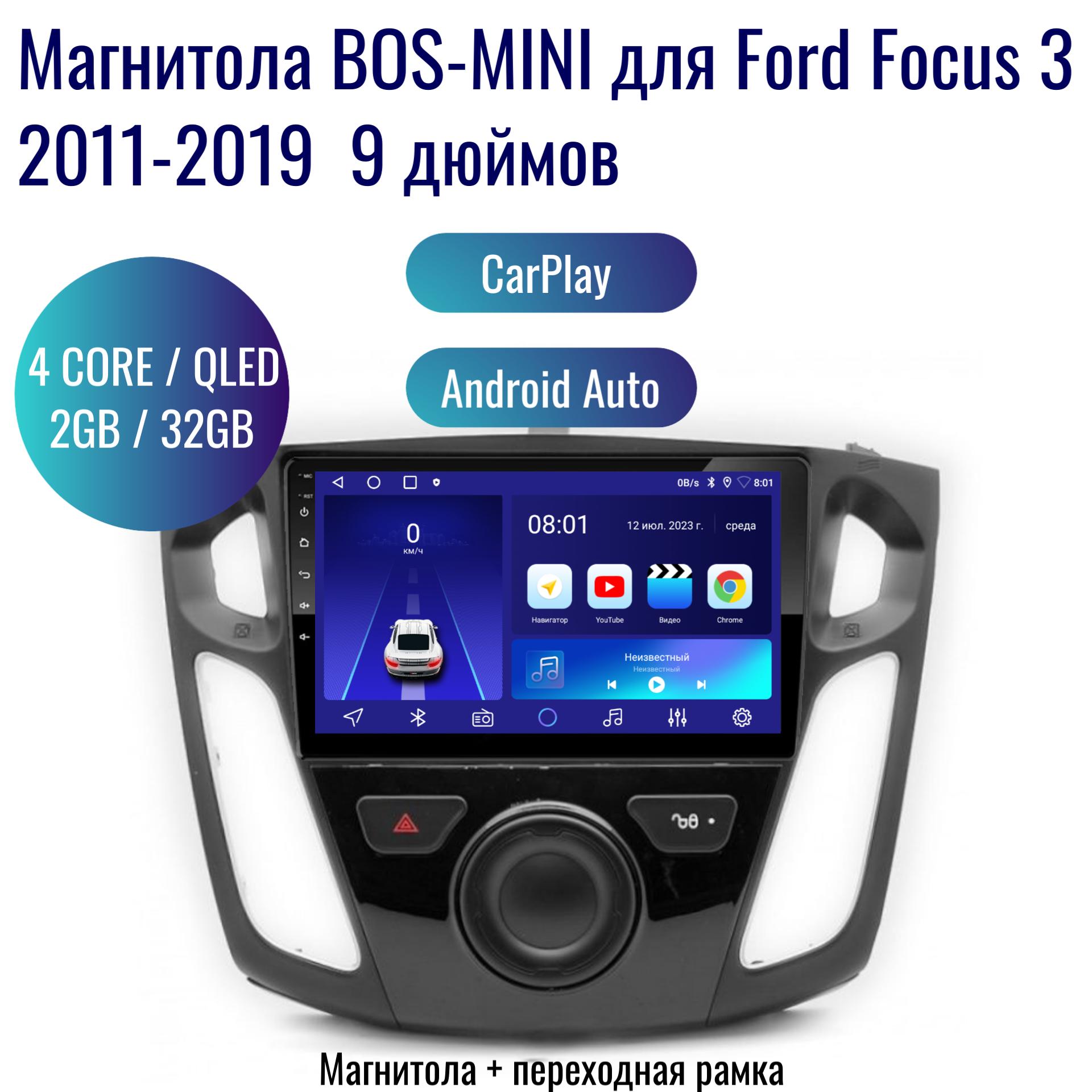 Автомагнитола BOS-MINI Android Ford Focus 3 2011-2019 / 4 ядер 2Gb+32Gb / 9 дюймов / GPS / Bluetooth / Wi-Fi / 2din / навигатор / CarPlay AndroidAuto информация: