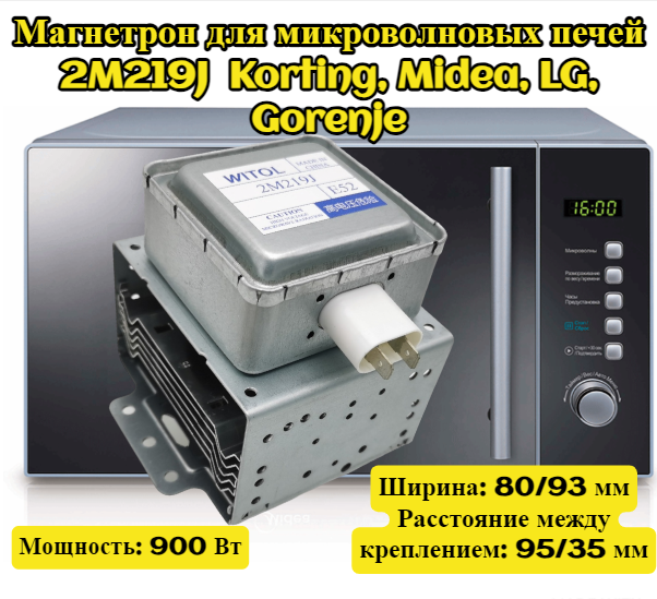 Магнетрон для микроволновых печей 2M219J Korting, Midea, LG, Gorenje, Мощность: 900 Вт информация: