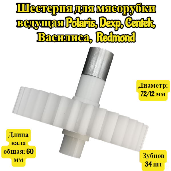 Шестерня для мясорубки ведущая подходит для Polaris, Dexp, Centek, Василиса, Redmond Диаметр 72 мм Длина вала : 60 мм Зубья 34 шт информация: