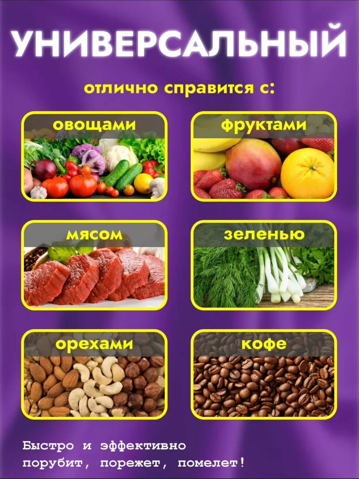 | Насадки | для нарезки кубиками, для нарезки ломтиками, мельничка, мясорубка, насадка-терка, универсальный нож, эмульсионная |