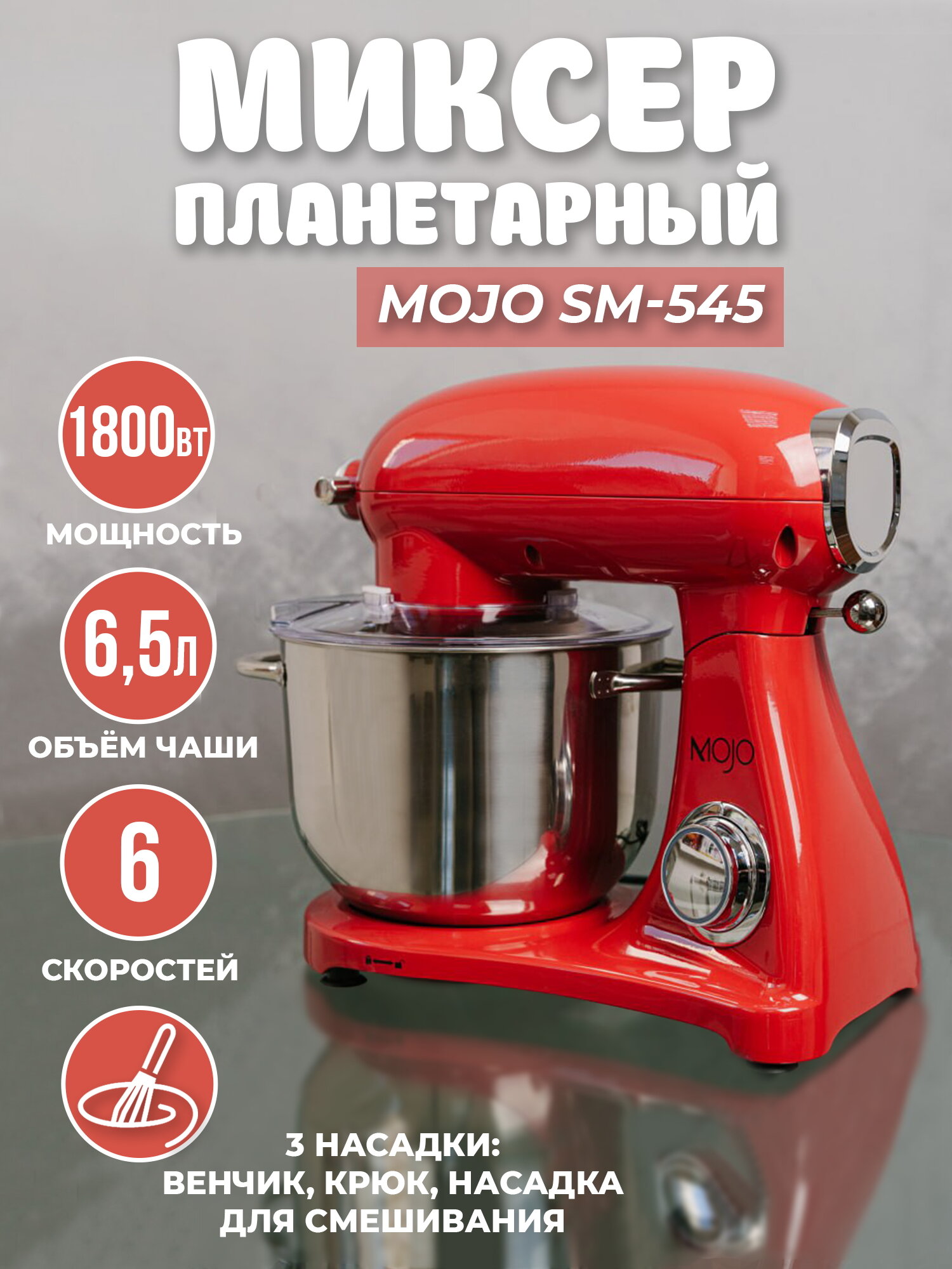 Миксер планетарный MOJO SM-545, объём чаши 6,5 л, 1800 Вт. информация: