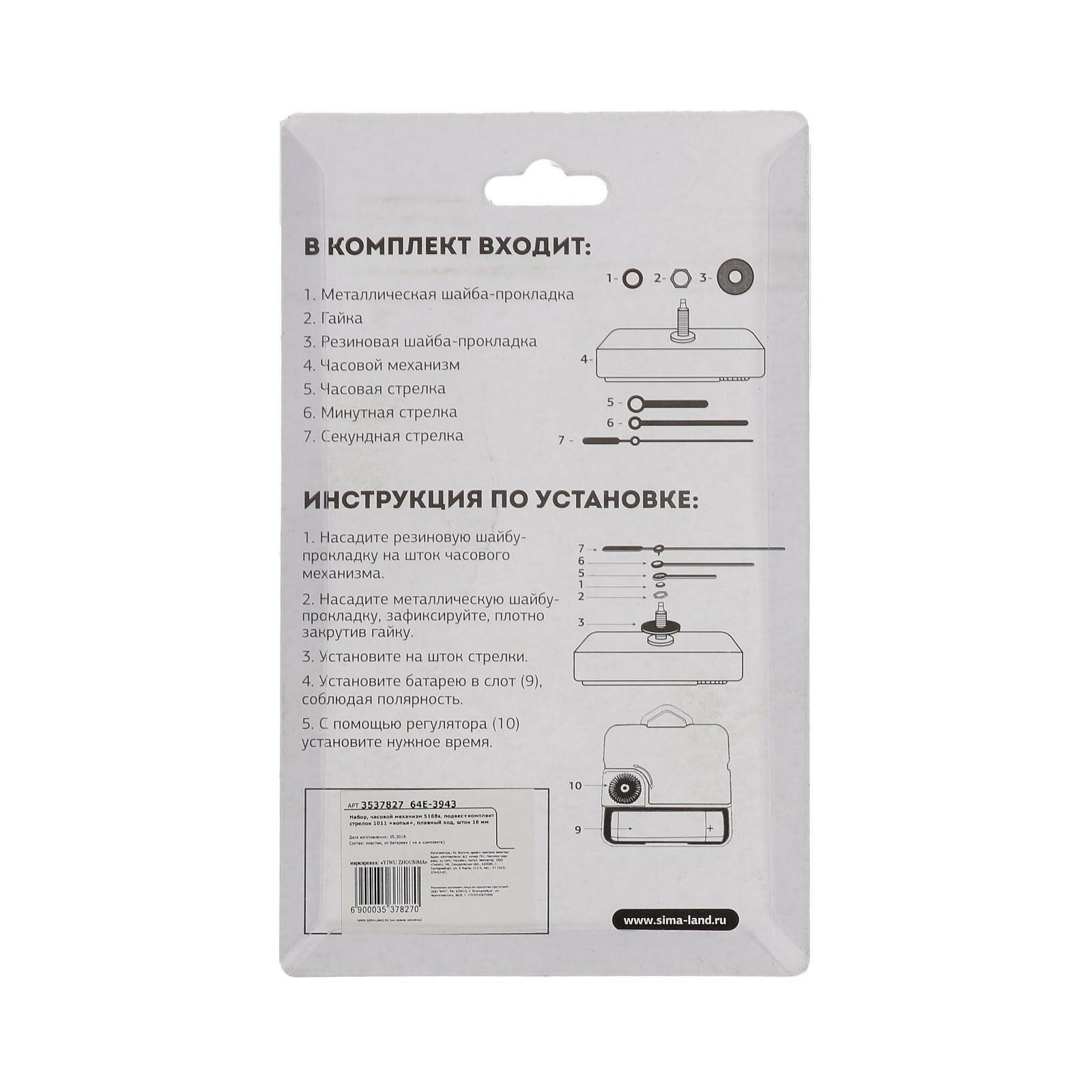 10 цен на Часовой механизм со стрелками "Соломон-4", плавный ход, шток 16 мм, стрелки 59/83/90 мм