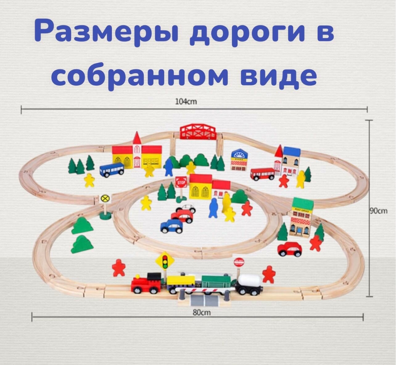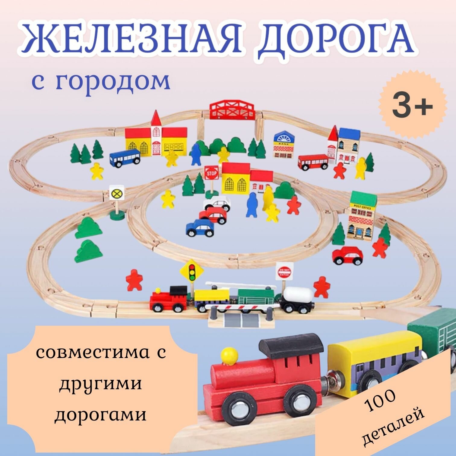 Деревянная железная дорога с городом, Большой набор 100 деталей. информация: