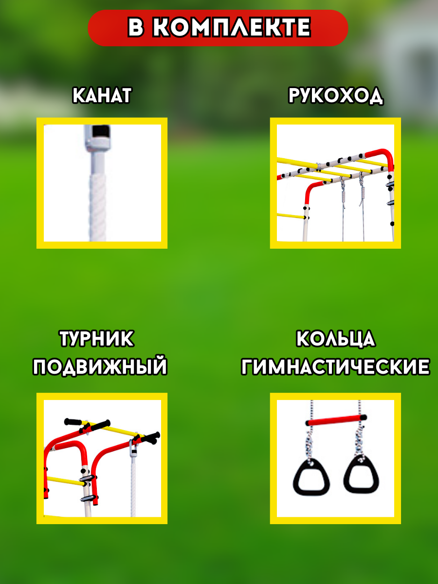 | В комплекте | гимнастические кольца, канат, рукоход, турник |