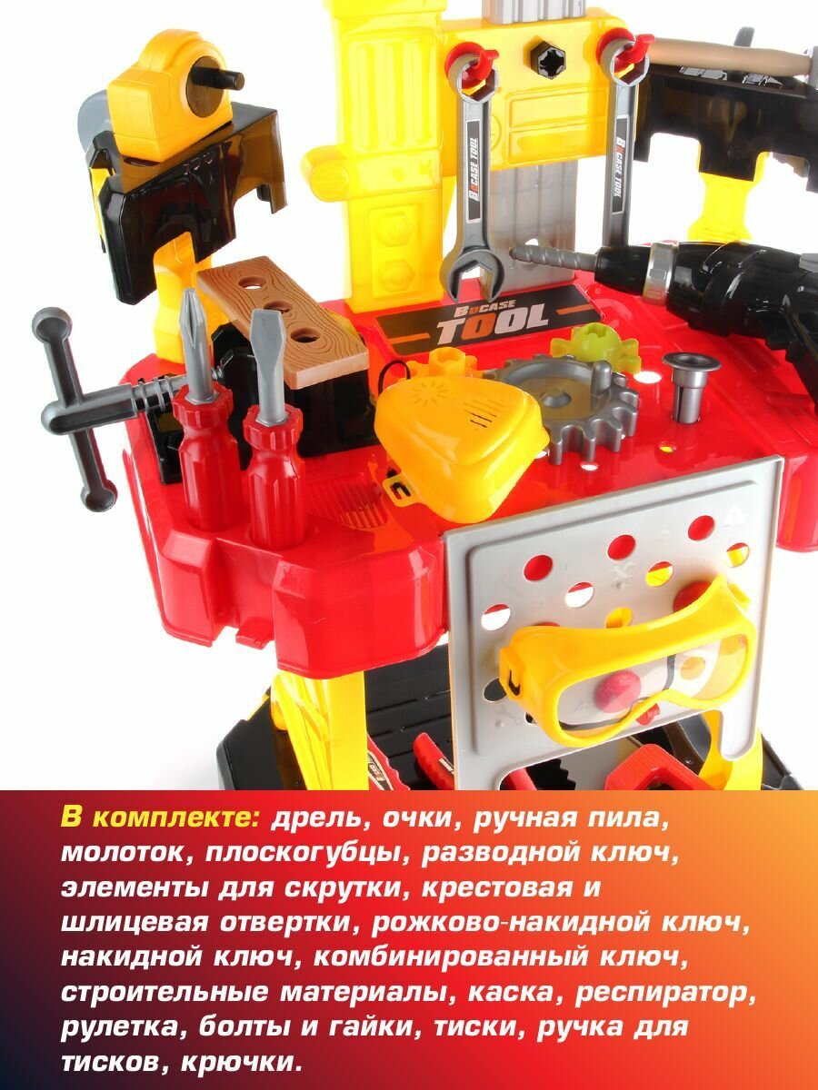 Игровой набор инструментов Строитель для мальчиков 85 предметов, Veld Co / Детская мастерская, стол верстак / Ящик с инструментами для детей