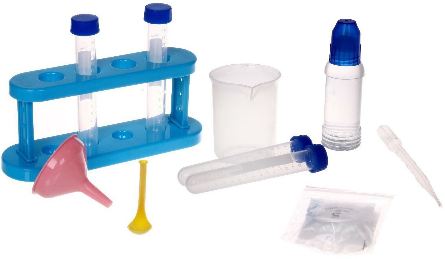 | Комплектация | жидкий клей (ПВА); 2 пробирки (15 мл); мензурка; пакетик с бурой; пакетик с содой; штатив для пробирок; воронка; мерная ложка; пипетка. |