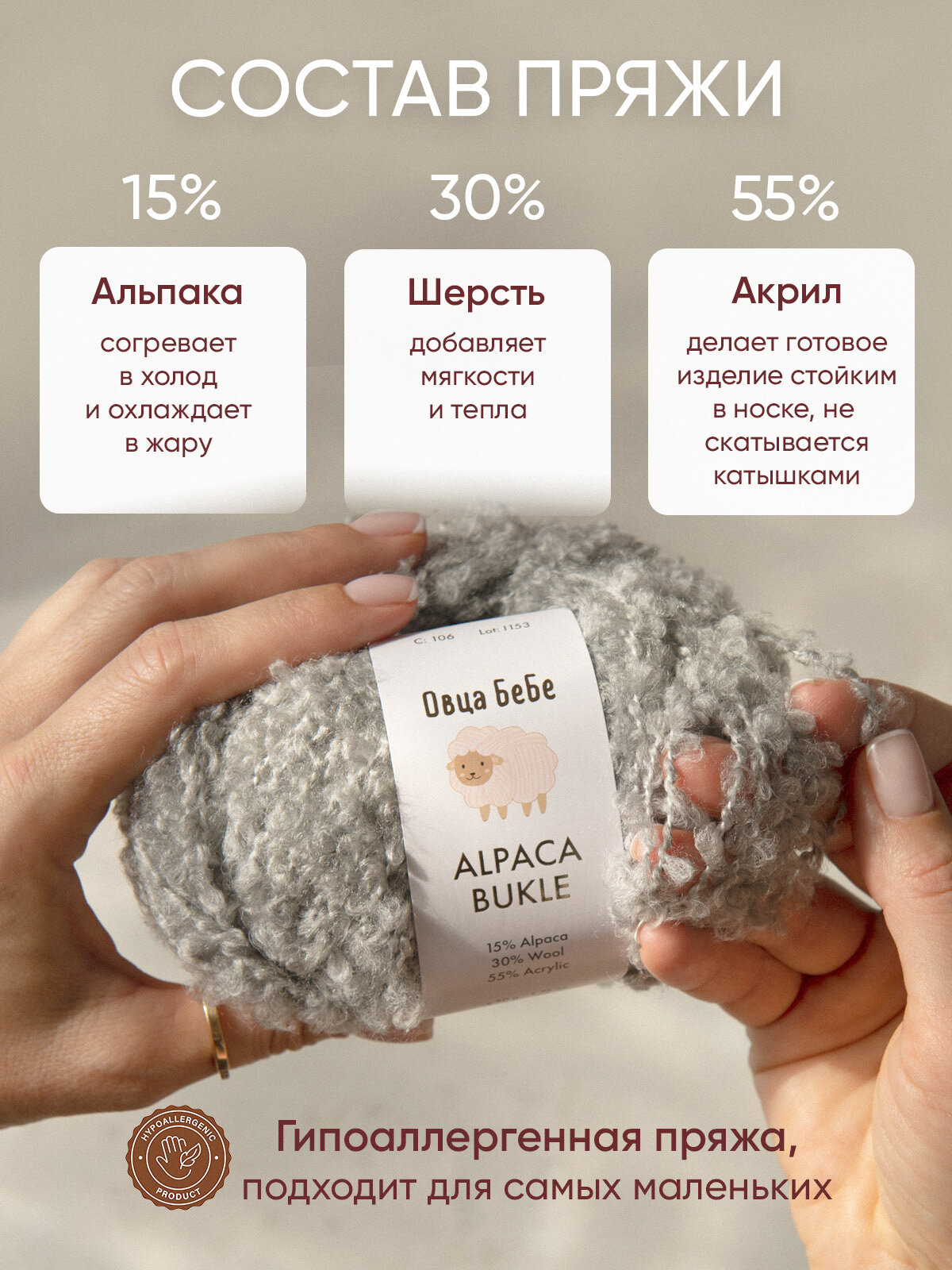 | Состав | 30% шерсть / 15% альпака / 55% акрил |