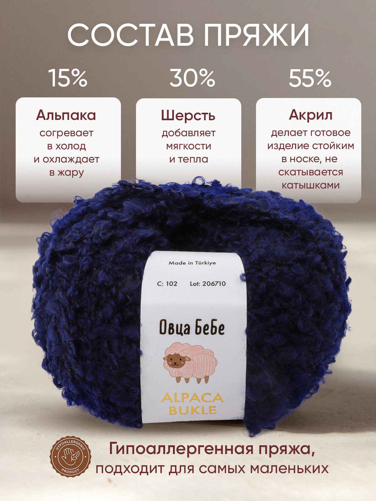 | Состав | 30% шерсть / 15% альпака / 55% акрил |