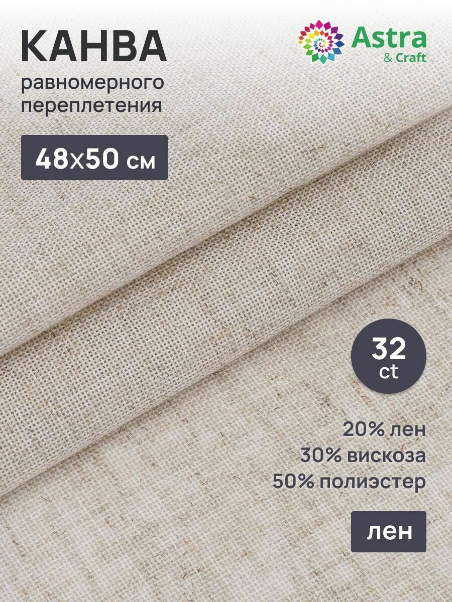 Ткань для вышивания равномерного переплетения (50% полиэстер, 30% вискоза, 20% лен) 32ct, 48*50 (+/- 1) см, цвет лен, Astra&Craft информация: