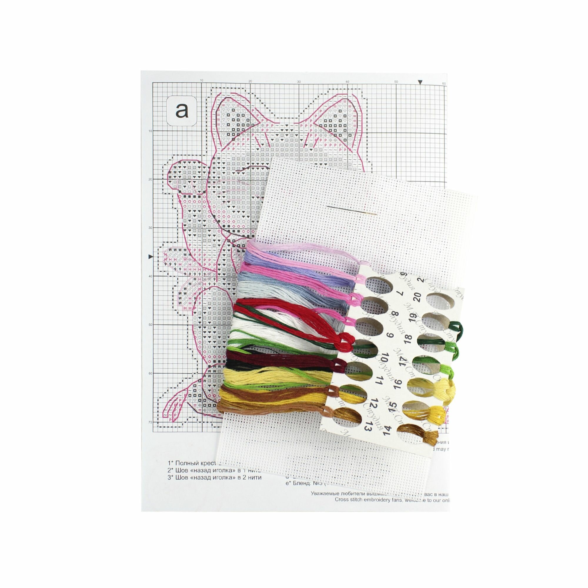 | Комплектация | Пластиковая канва, хлопковое мулине 19 цв., двухцветная символьная схема, игла, инструкция |