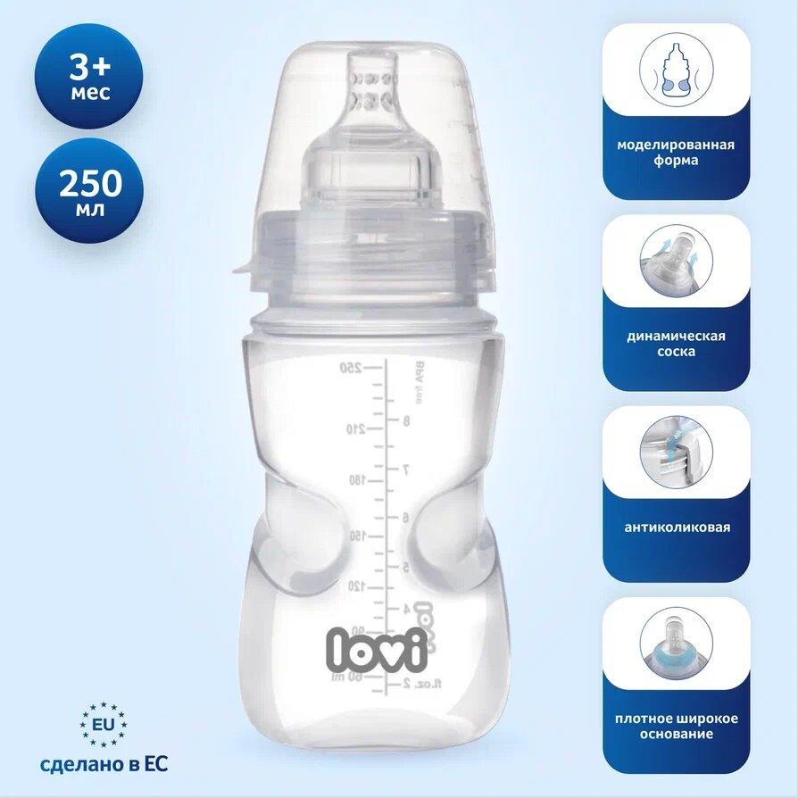 | Дополнительная информация | Антиколиковая бутылочка для кормления Lovi в комплекте с динамической силиконовой пустышкой. |
