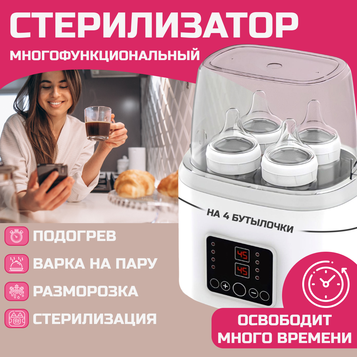 Подогреватель для 4 бутылочек с функцией размораживания и стерилизации информация: