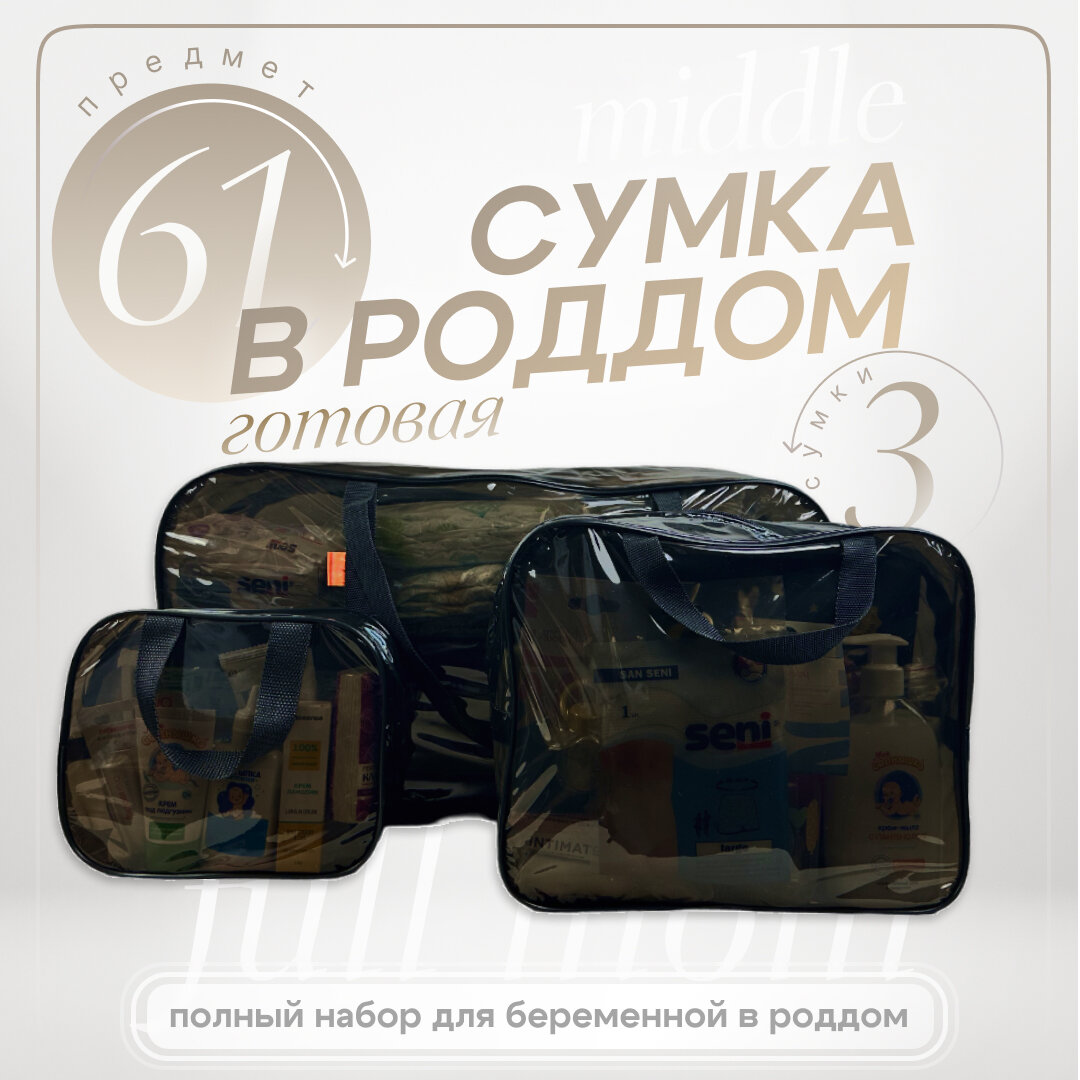 Сумка в роддом готовая для мамы и малыша с наполнением Full mom Middle, 61 предмет, прозрачная 8 640 ₽