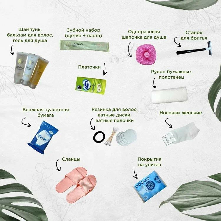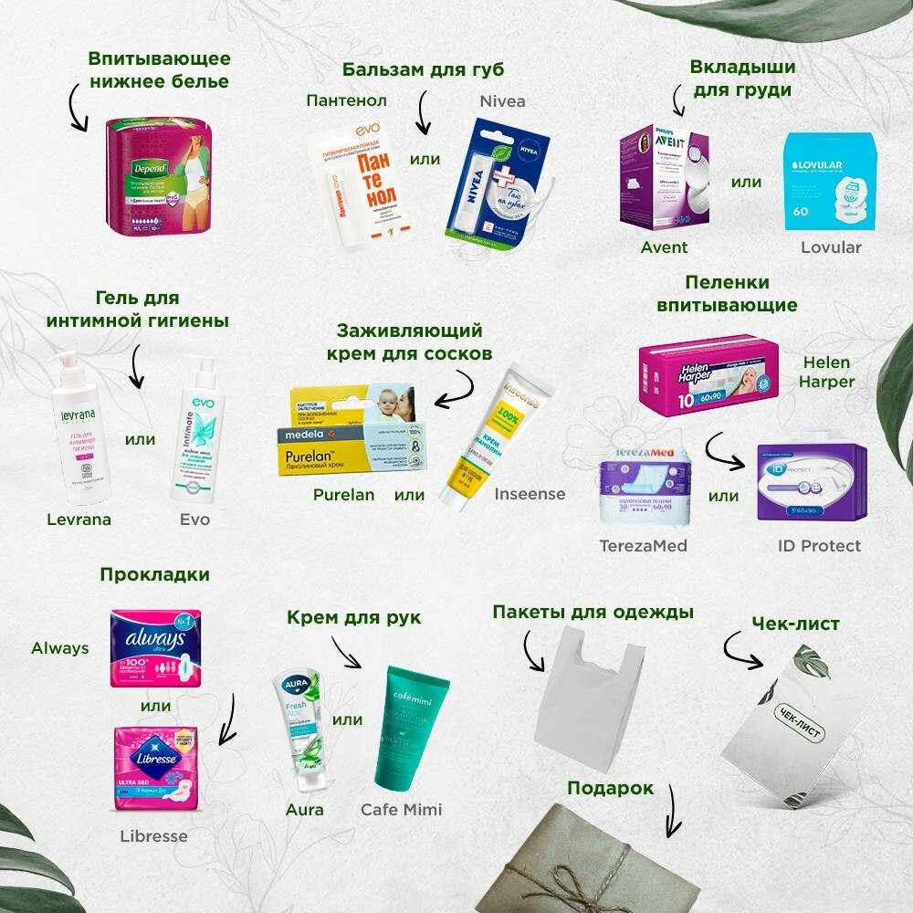 | Состав набора | бахилы, ватные диски, ватные палочки, влажная туалетная бумага, влажные салфетки, крем для сосков, мочалка, мыло, накладки для кормления, носочки для новорожденного, одноразовые маски, одноразовые покрытия на сиденье унитаза, пеленки для мамы, пеленки для новорожденного, подгузники, прокладки для груди, прокладки послеродовые, тапочки, шапочка для душа, шапочка для новорожденного |