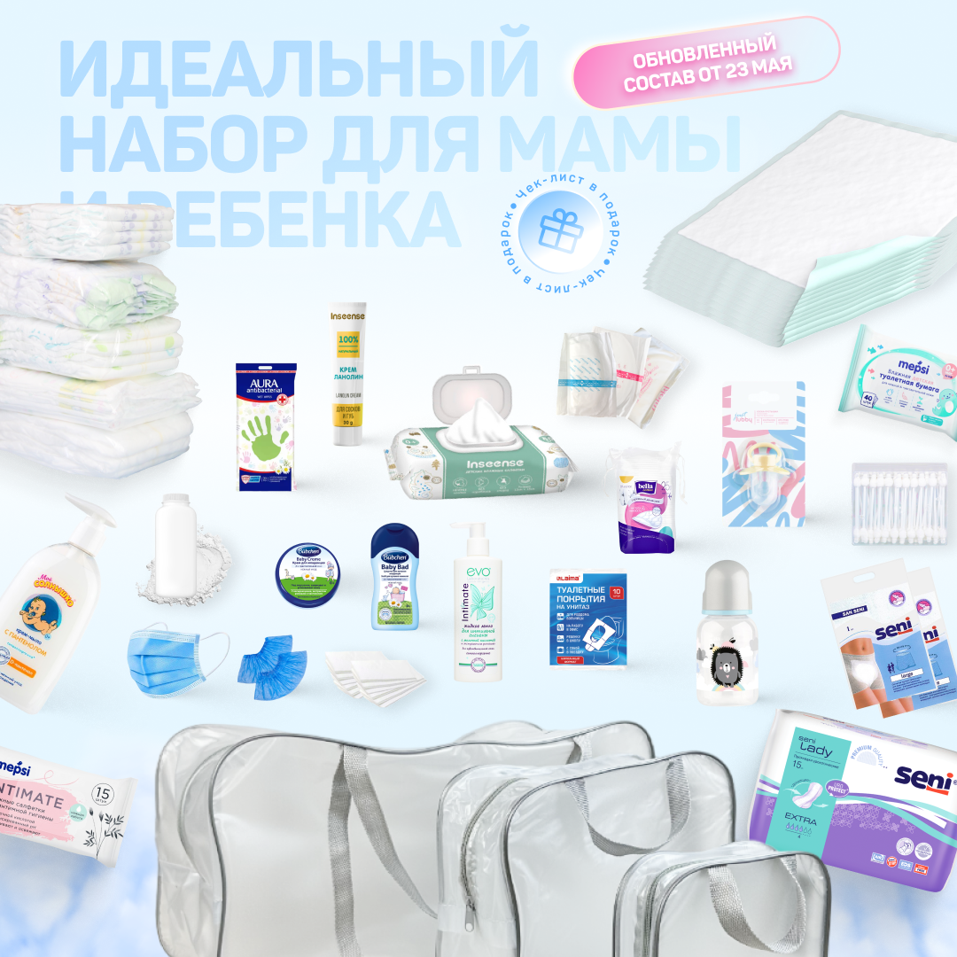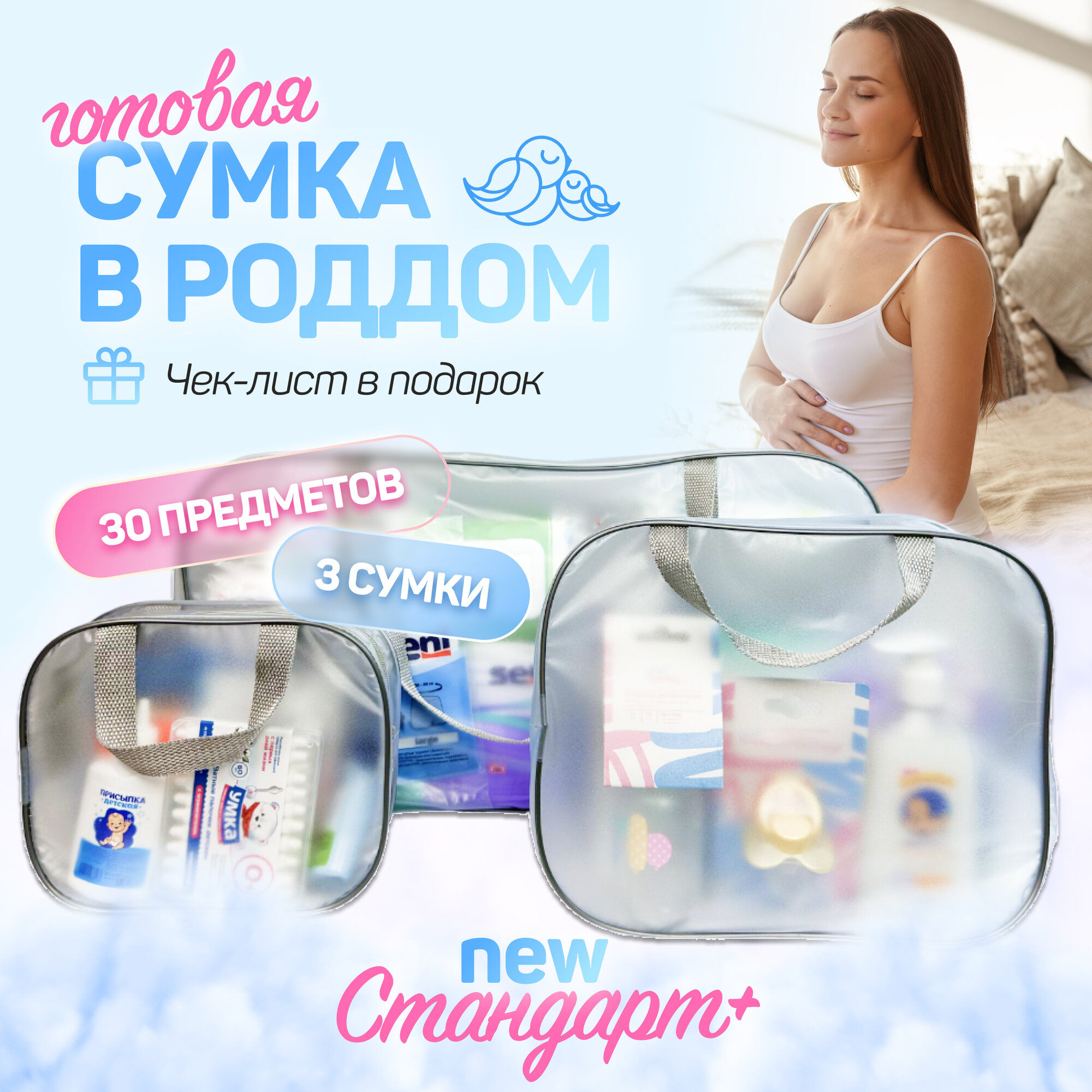 Сумка в роддом для мамы и малыша готовая с наполнением, 30 предметов + 3 сумки, комплектация "Стандарт+", прозрачная 7 076 ₽