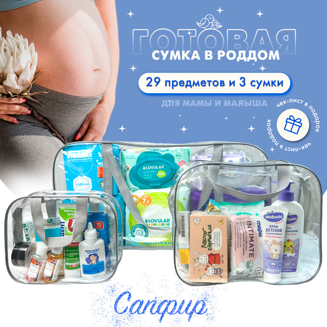 Отзывы на Сумка в роддом готовая для мамы и малыша с наполнением, 29 предметов, 3 прозрачные сумки, комплектация "Сапфир"