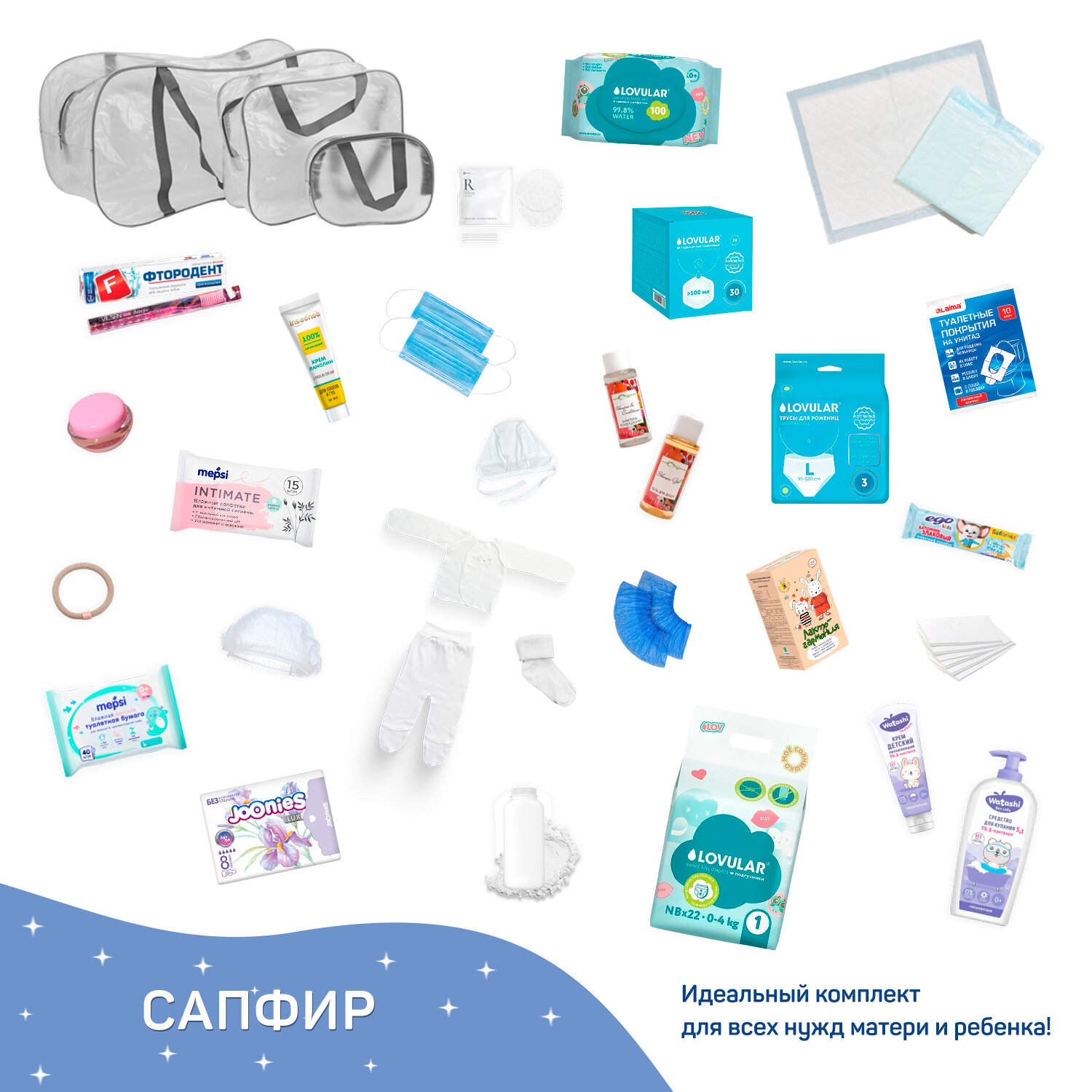 Сумка в роддом готовая для мамы и малыша с наполнением, 29 предметов, 3 прозрачные сумки, комплектация "Сапфир"