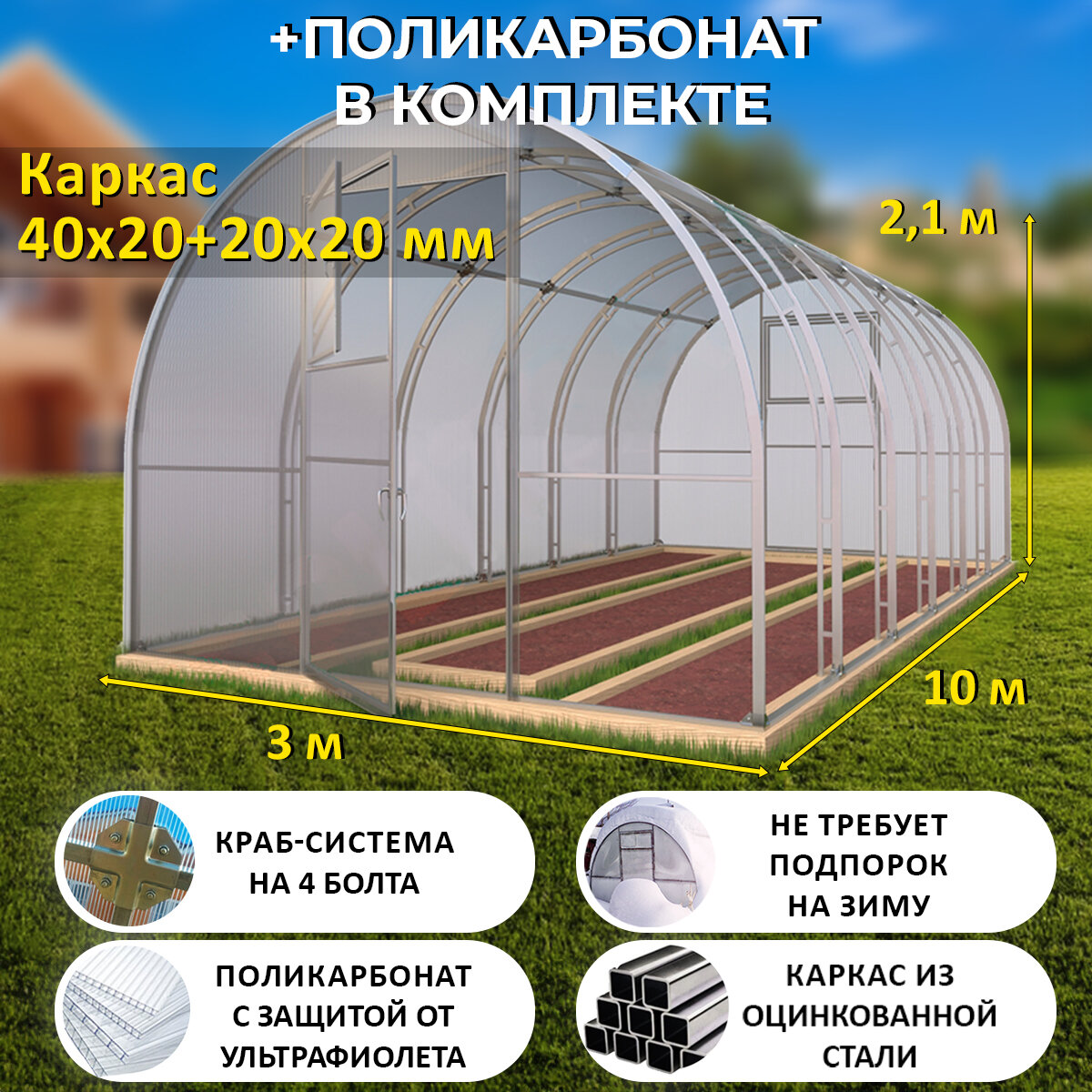 10 цен на Теплица Арочная (Поликарбонат в комплекте) 3 х 10 метров, оцинкованный каркас 40х20+20x20 мм - Боярская Премиум