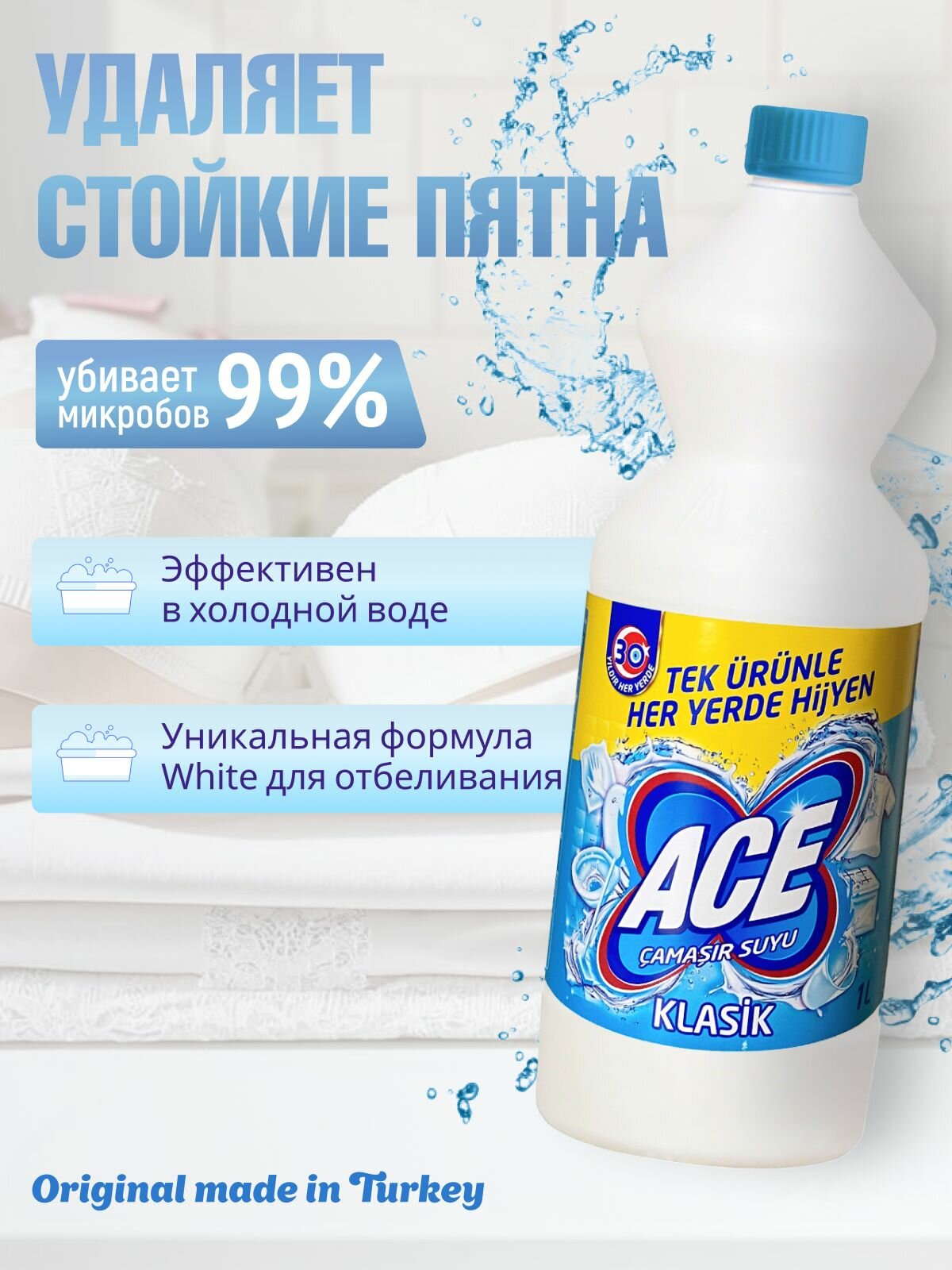 Отбеливатель и пятновыводитель ACE для белого белья Classic 1л 14шт информация:
