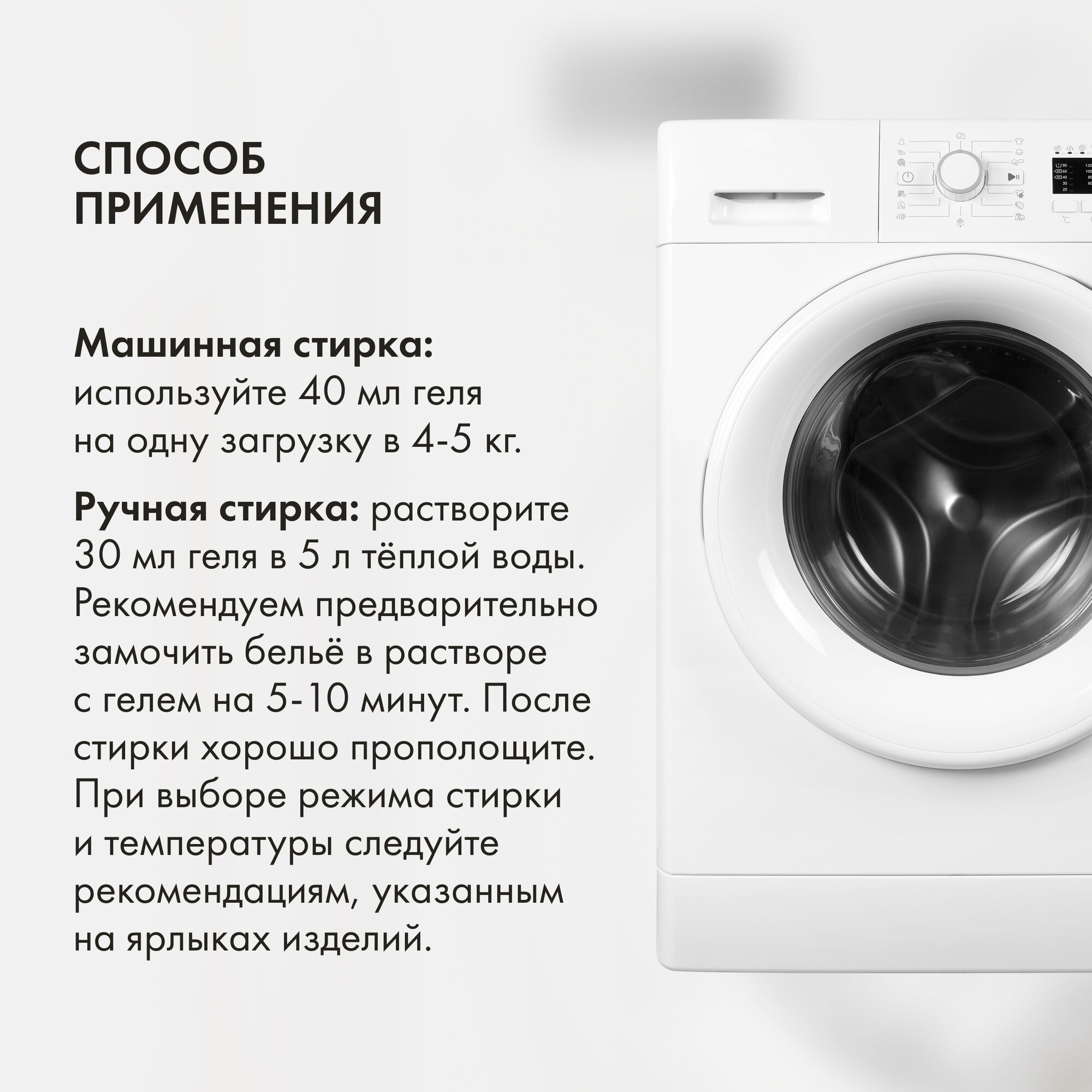 | Способ применения | 1. Машинная стирка: используйте 40 мл геля на одну загрузку в 4-5 кг. 2. Ручная стирка: растворите 30 мл геля в 5 л тёплой воды. Рекомендуем предварительно замочить бельё в растворе с гелем на 5-10 минут. После стирки хорошо прополощите. При выборе режима стирки и температуры следуйте рекомендациям, указанным на ярлыках изделий. |