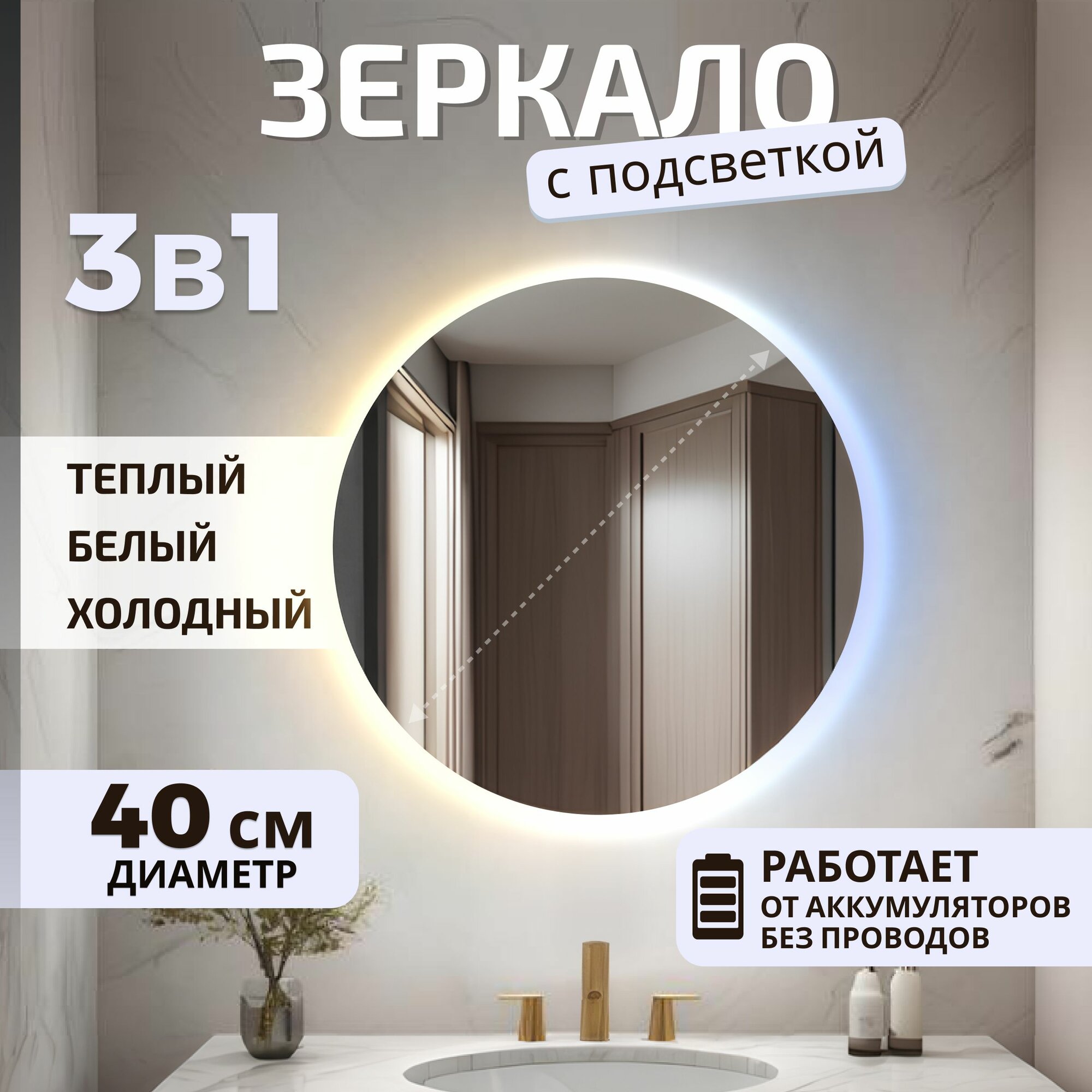 10 цен на Зеркало настенное с подсветкой на аккумуляторе + зарядное устройство, круглое 40 см. Три режима подсветки