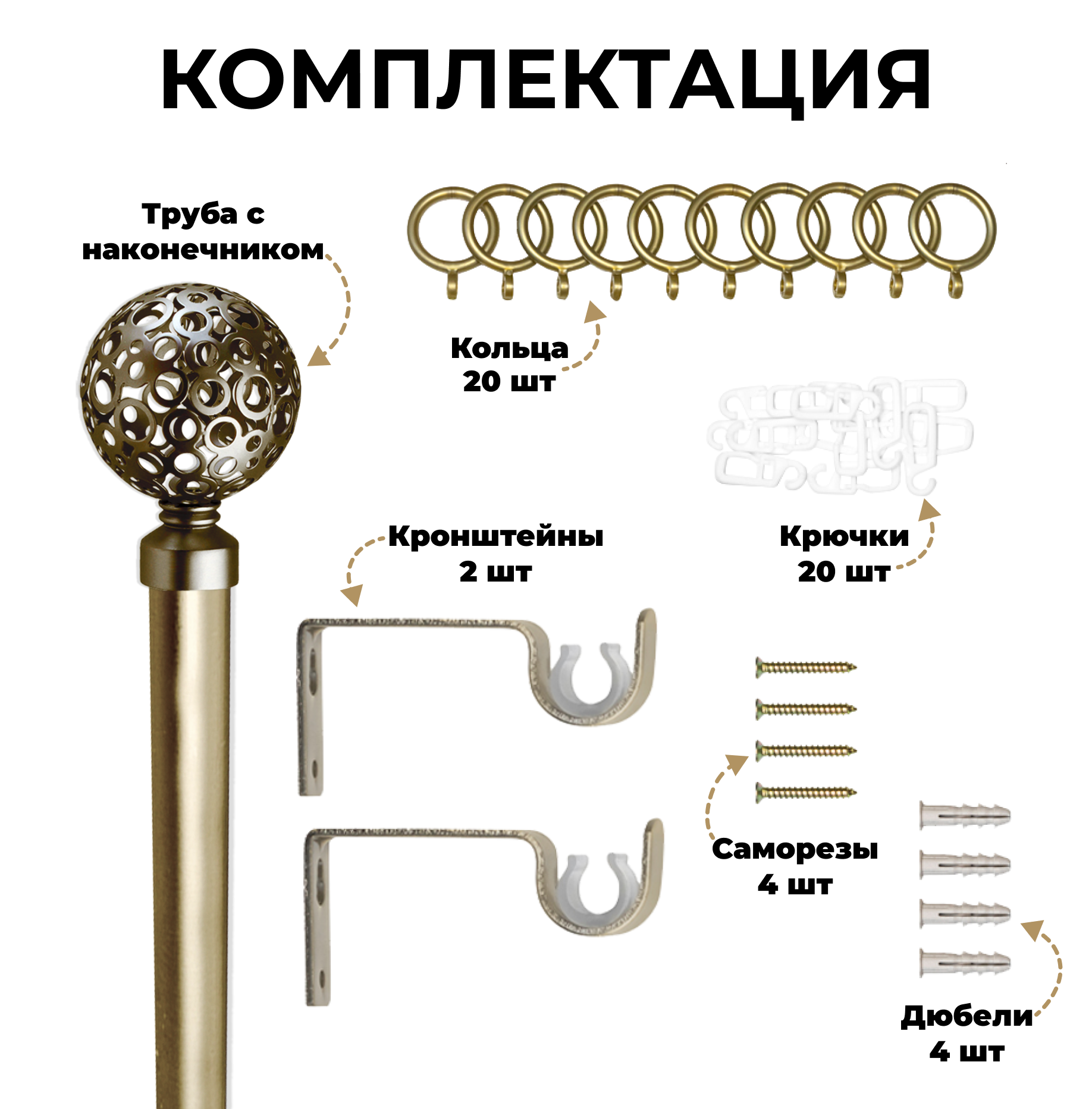 | Комплектация | Труба металлическая гладкая Ø16мм - 1шт; Наконечники металлические - 2 шт; Кронштейны металлические; Кольца пластиковые + крючки; Комплект крепежа (дюбеля, шурупы). |