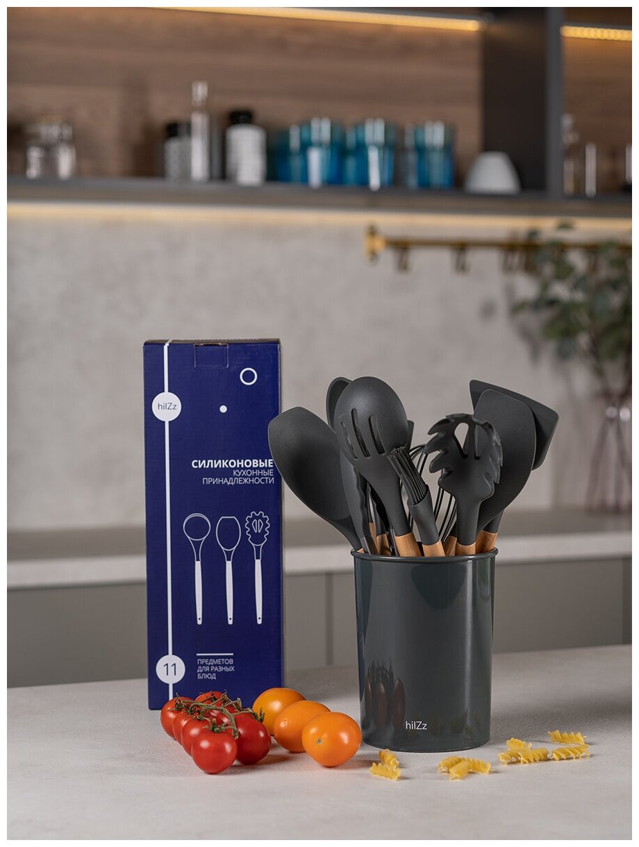 10 цен на Набор кухонных принадлежностей силиконовый с подставкой, серый