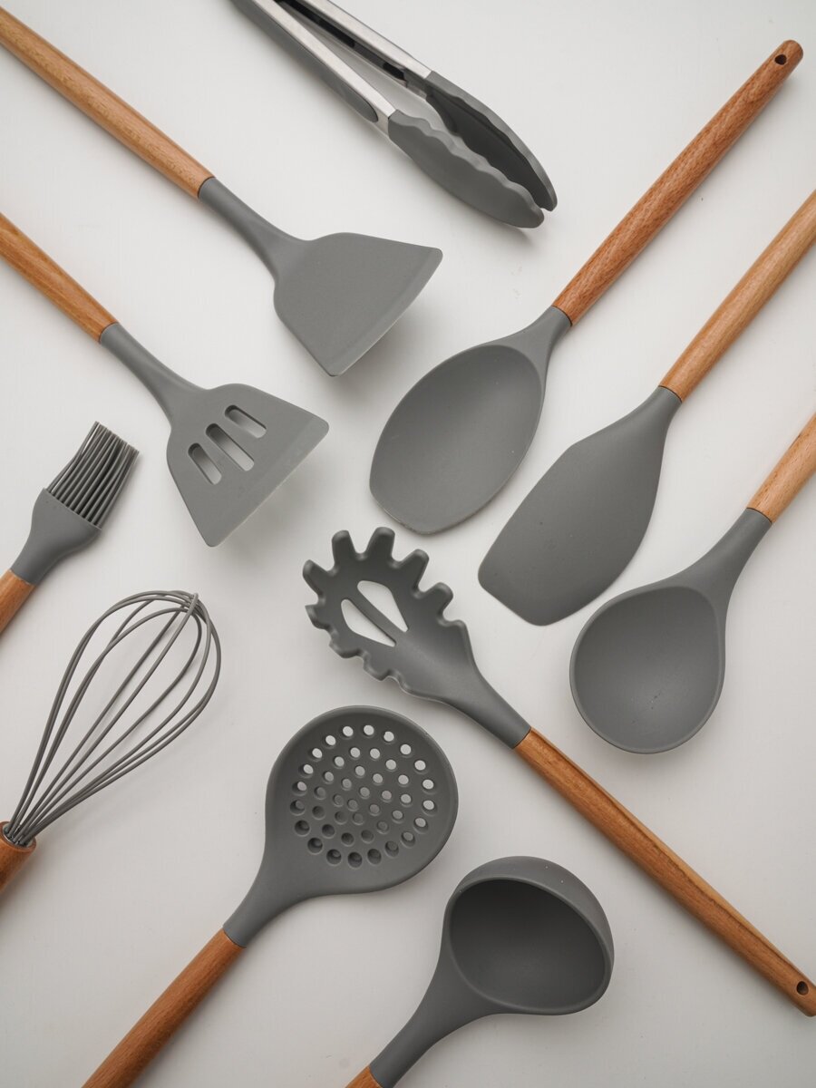 10 цен на Набор кухонных принадлежностей силиконовый с подставкой, светло-серый