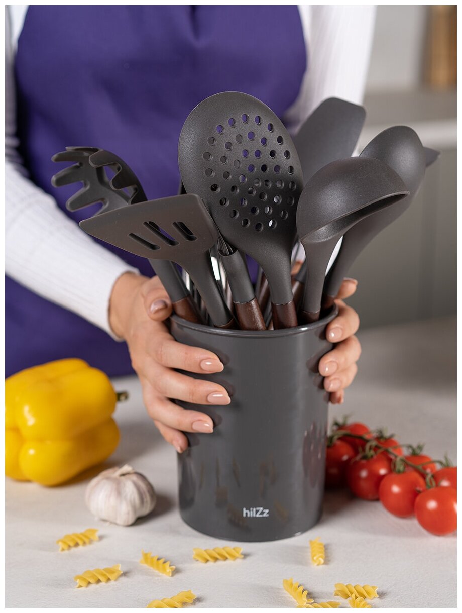 10 цен на Набор кухонных принадлежностей силиконовый с подставкой, коричнево-серый