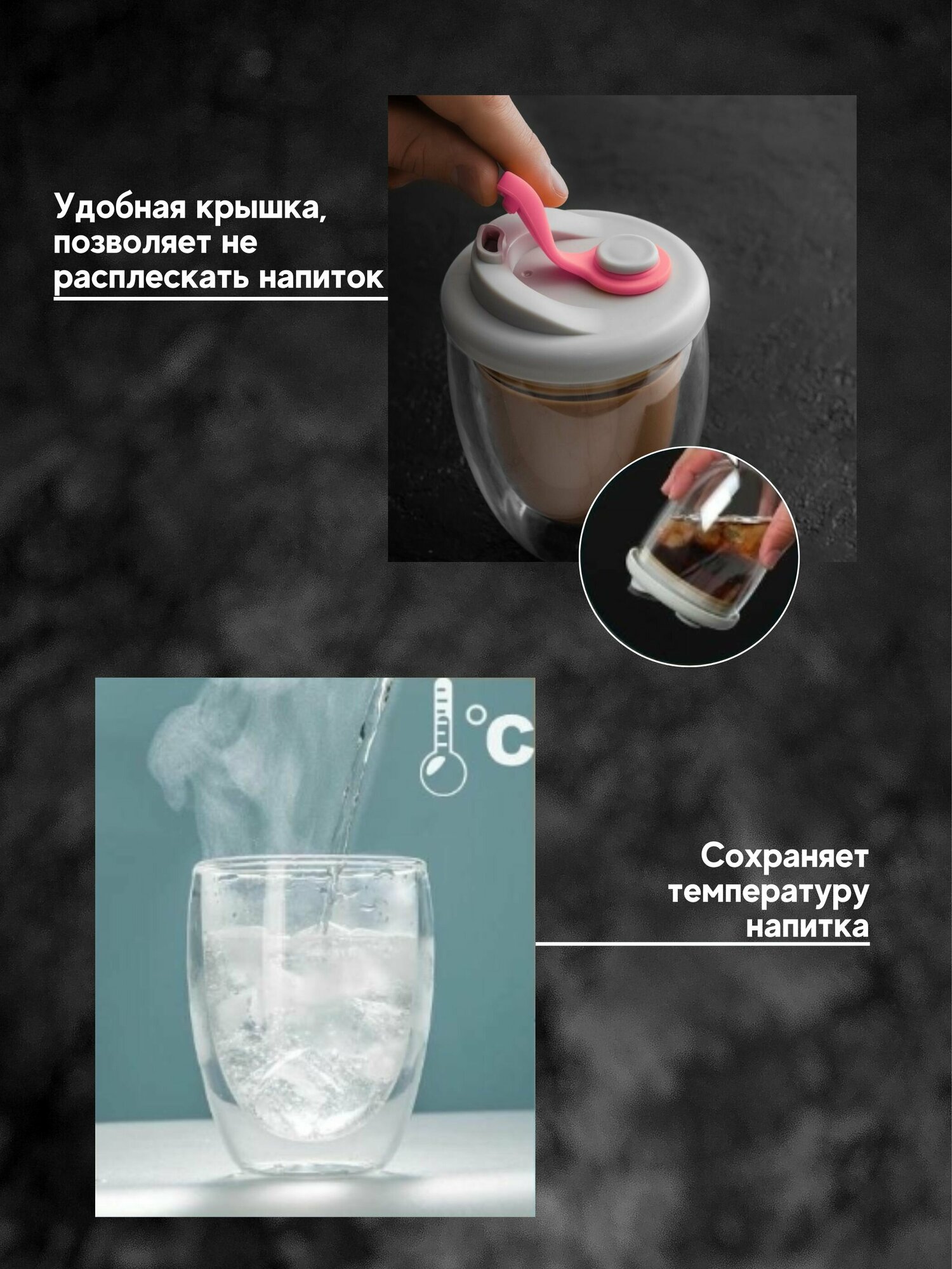 Термокружка с крышкой, термостакан для кофе, непроливайка, стакан стеклянный с двойными стенками для холодных и горячих напитков 350мл розовый носик