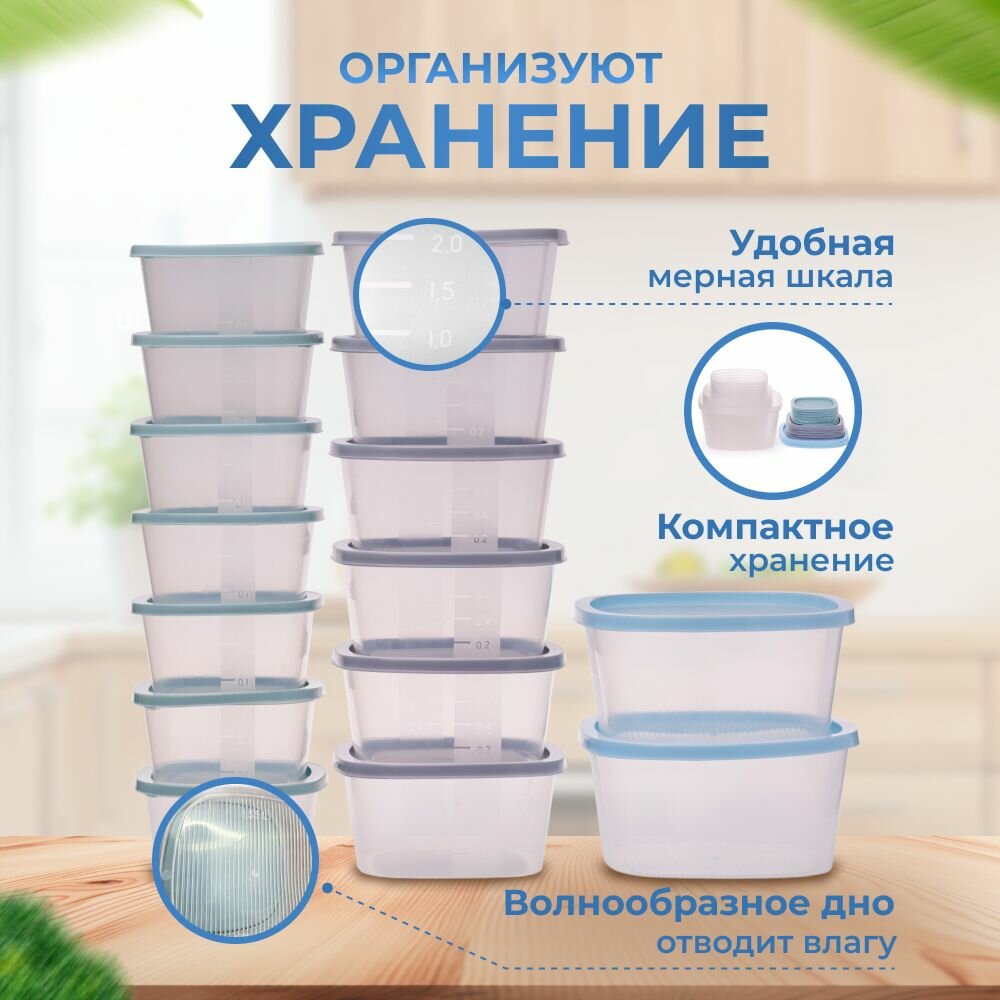 Набор пищевых контейнеров SparkPlast, квадратные, пластик, голубой/серый, 15 штук информация: