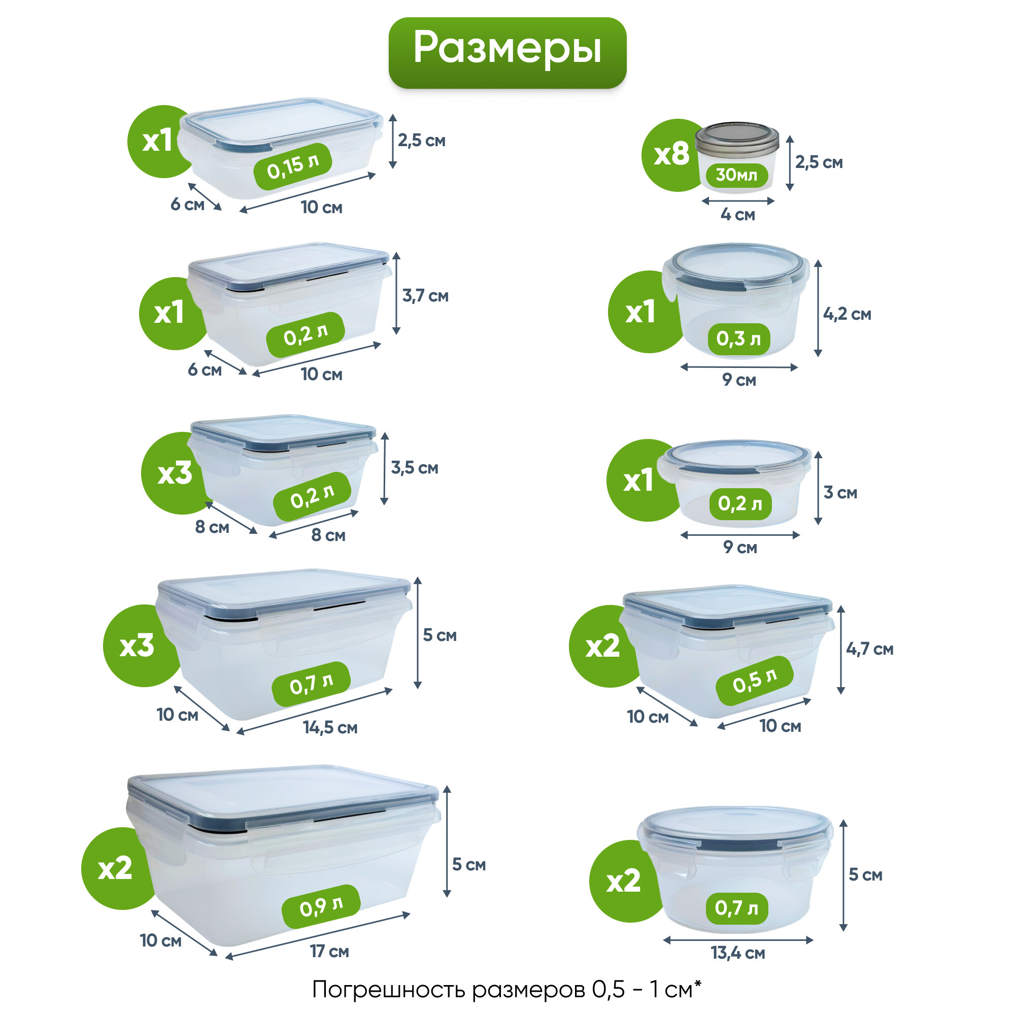 | Комплектация | Набор контейнеров с герметичными крышками (24 шт): - квадратный контейнер 976 мл - 2 шт; - квадратный контейнер 828 мл - 3 шт; - круглый контейнер 680 мл - 2 шт; - квадратный контейнер 532 мл - 2 шт; - квадратный контейнер 325 мл - 3 шт; - квадратный контейнер 296 мл - 2 шт; - круглый контейнер 296 мл - 2 шт; - круглый контейнер 30 мл - 8 шт - наклейки для контейнеров - 24 шт; - маркер - 1 шт. |