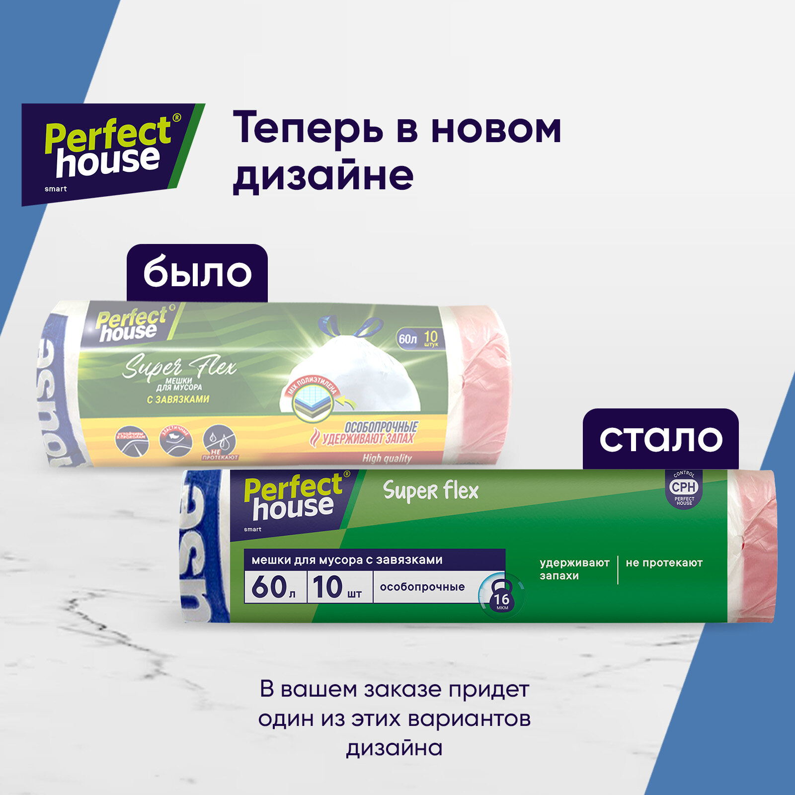 Мешки для мусора Perfect House Super Flex прочные, полиэтиленовые с завязками 10 штук в рулоне, 60 литров информация: