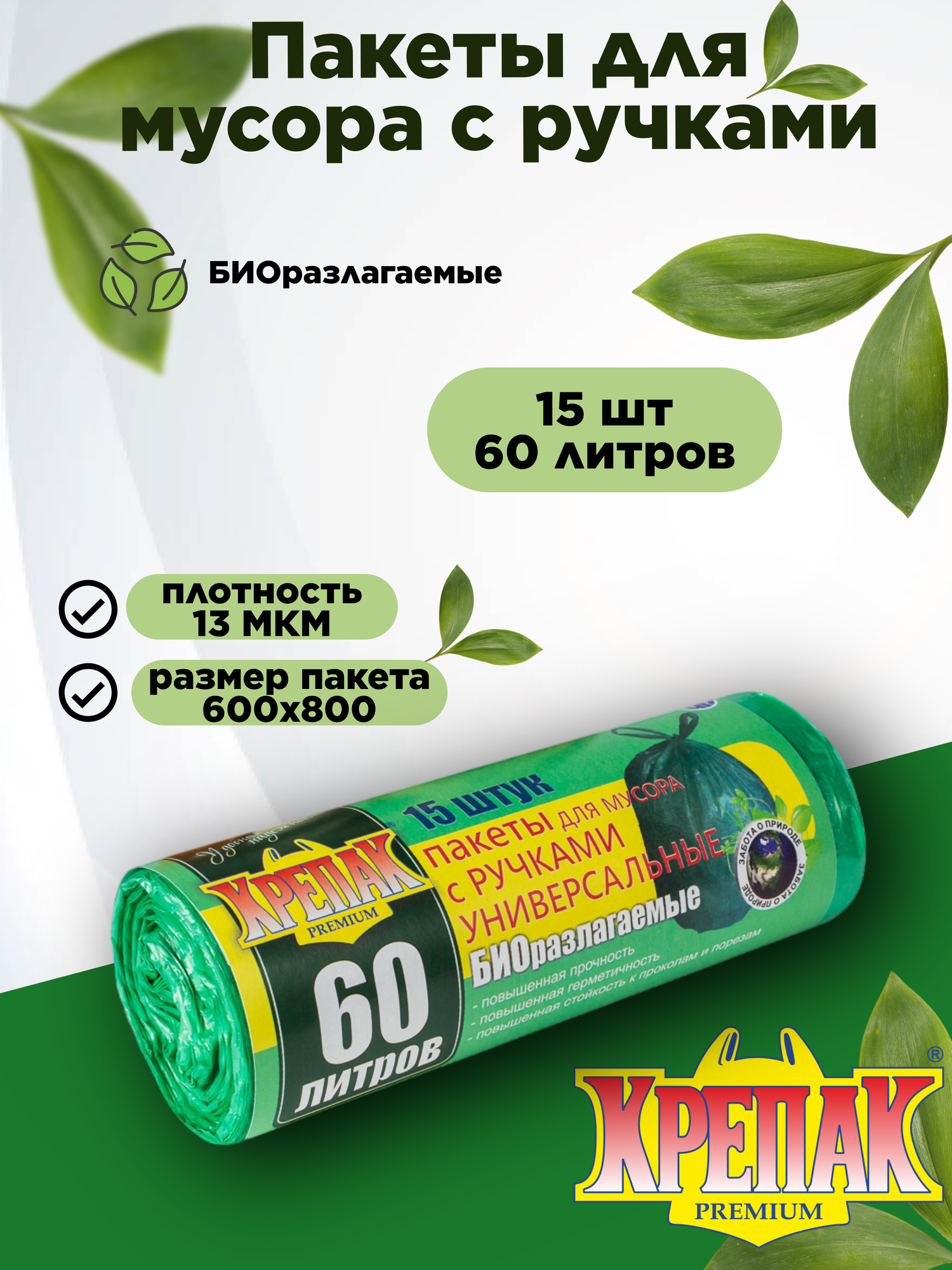 Мешки для мусора с ручками в рулоне Крепак биоразлагаемые 60 л, 15 шт информация: