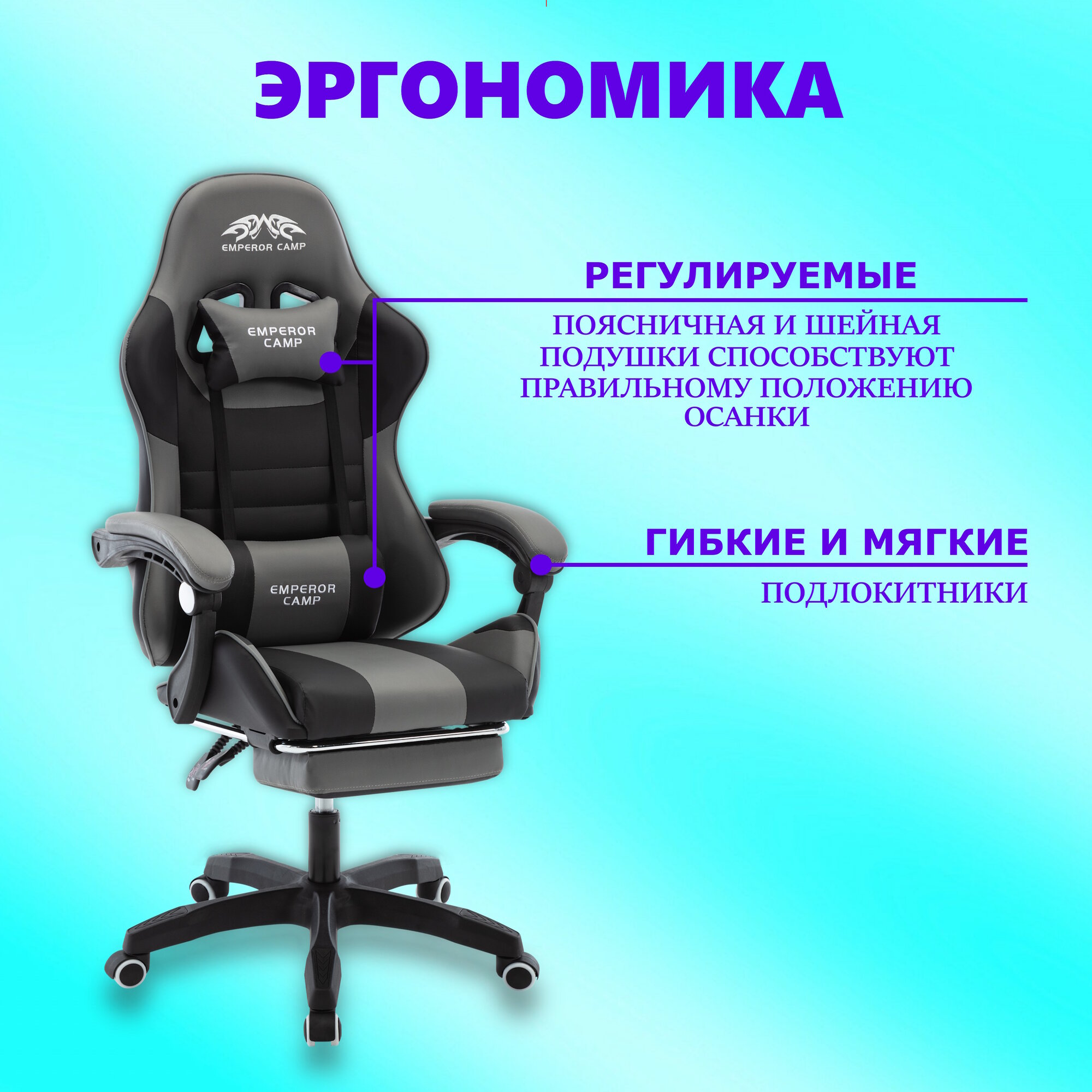 Игровое компьютерное кресло EMPEROR CAMP 925, Черно-серое с подставкой для ног информация: