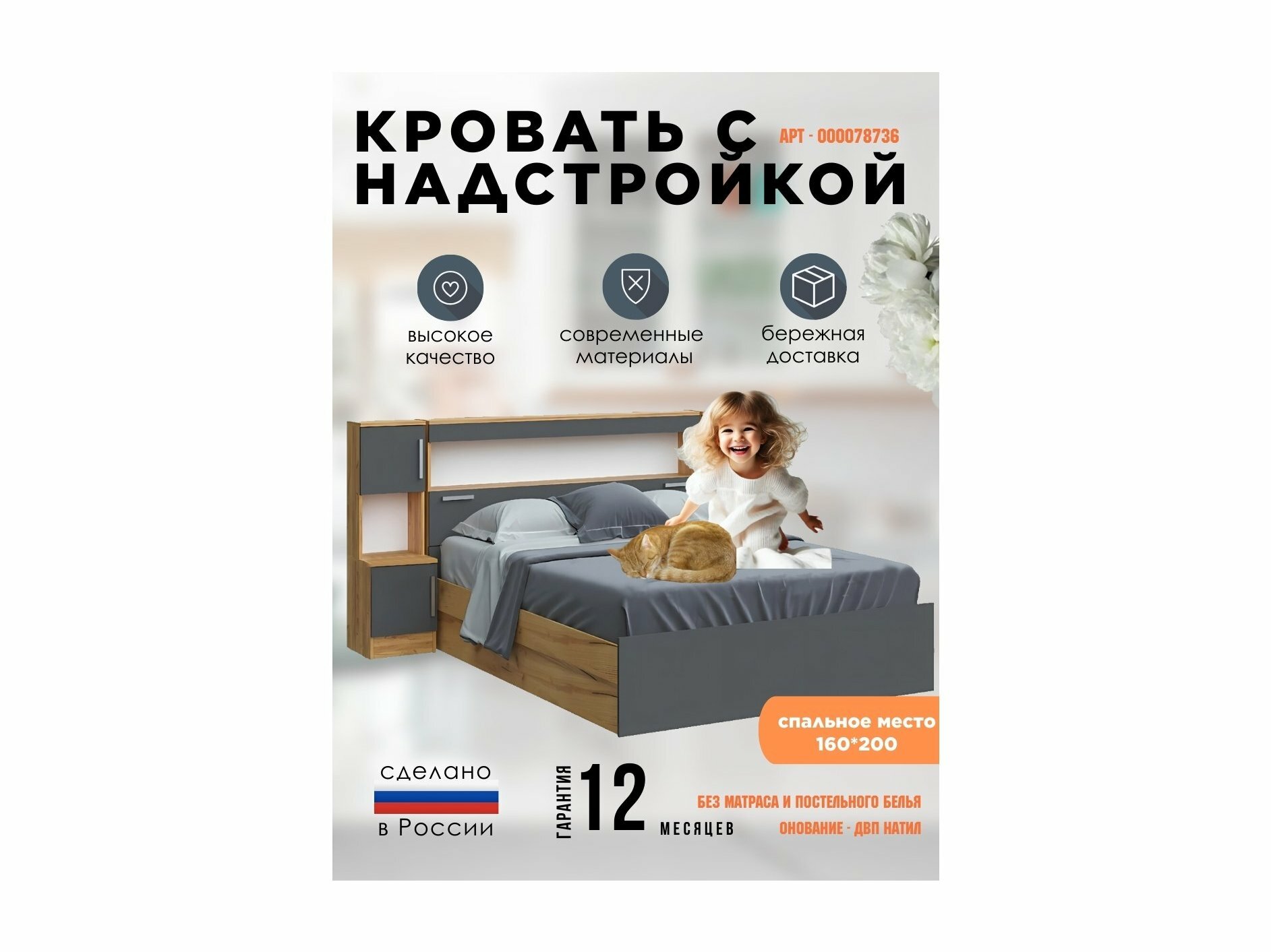 Бася Кровать с надстройкой 160 (Дуб крафт/ Графит) информация: