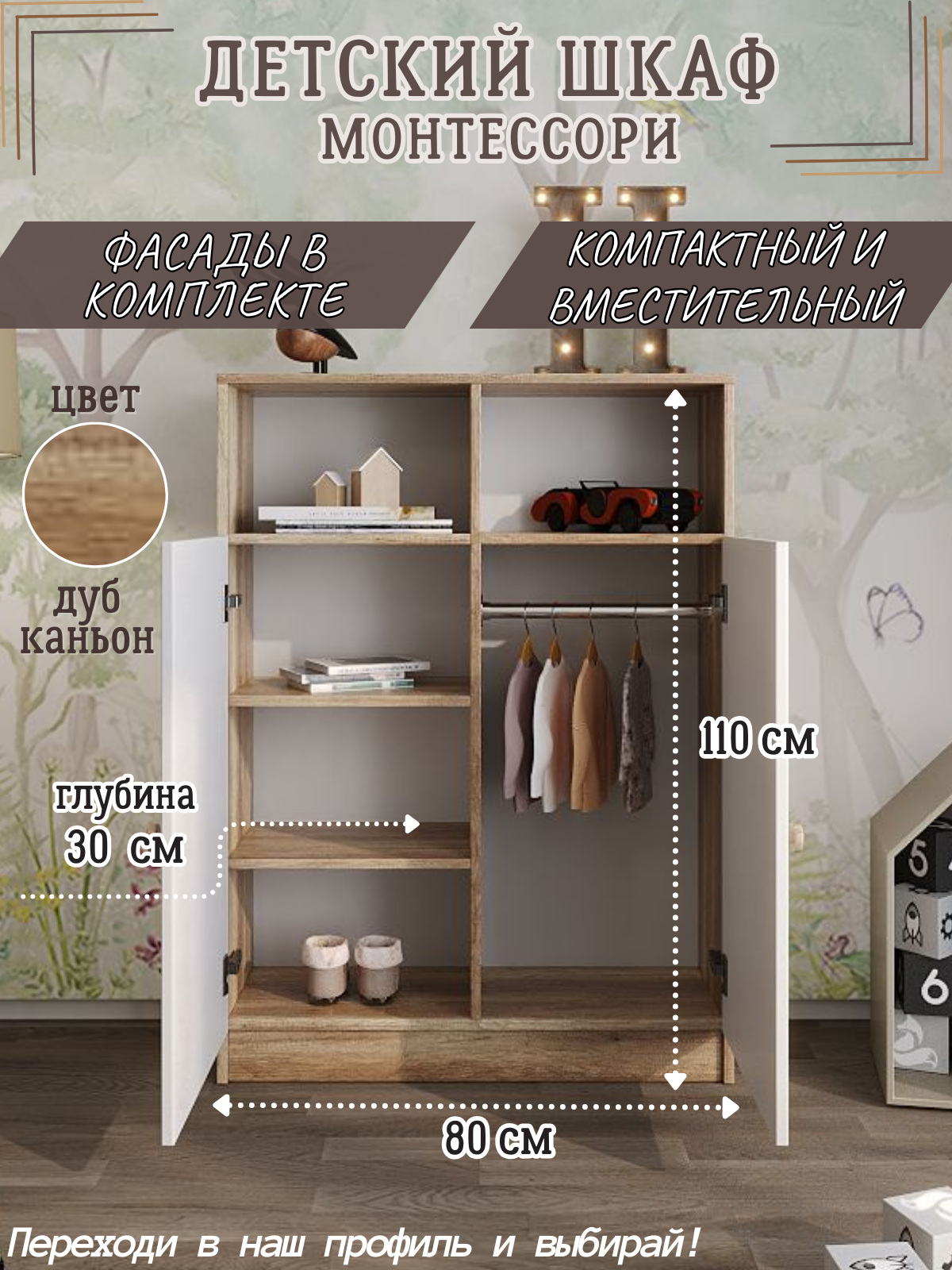 Отзывы на Детский шкаф для одежды Монтессори, 2 двери, 80х30х110, ЛДСП, дуб коньон