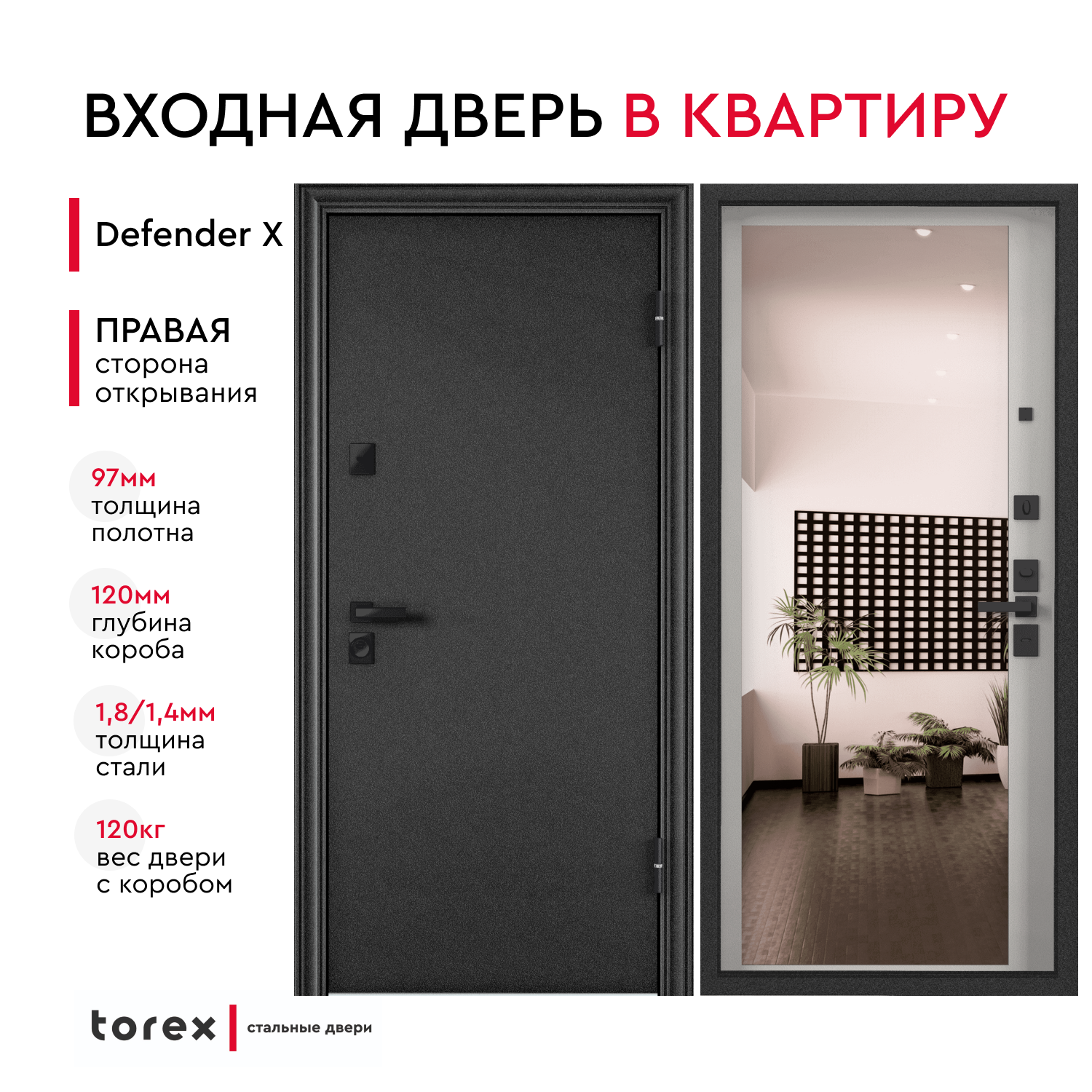 Дверь входная металлическая в квартиру Torex Defender X 950х2050 правая, усиленная шумоизоляция и герметичность, антикоррозия, замки 4ый класс защиты информация: