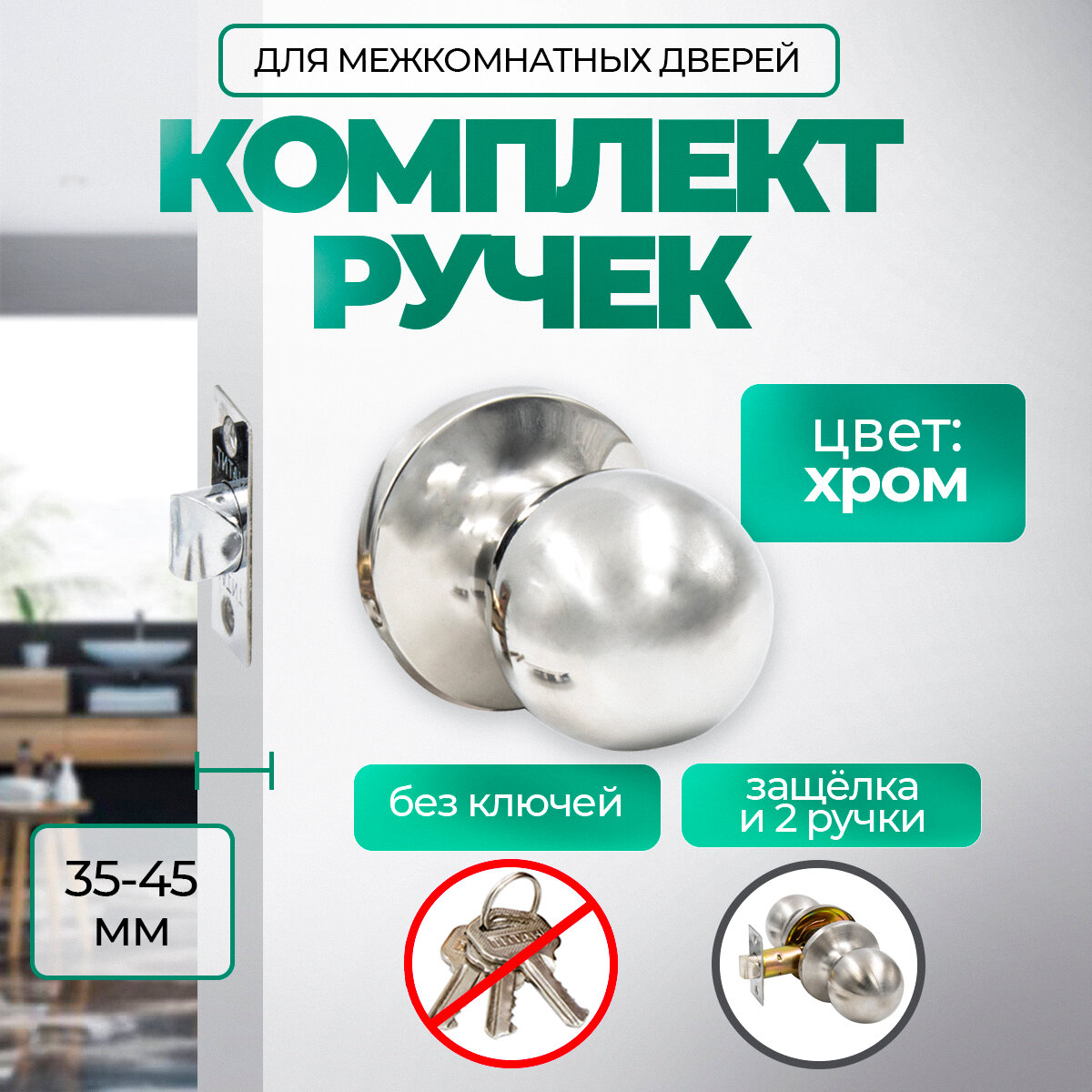 Ручка дверная межкомнатная хром блестящий с защелкой, заверткой и ключами комплект