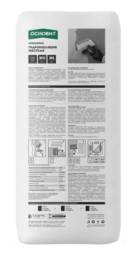 Проникающая гидроизоляция Основит Акваскрин НС65 (20 кг) информация: