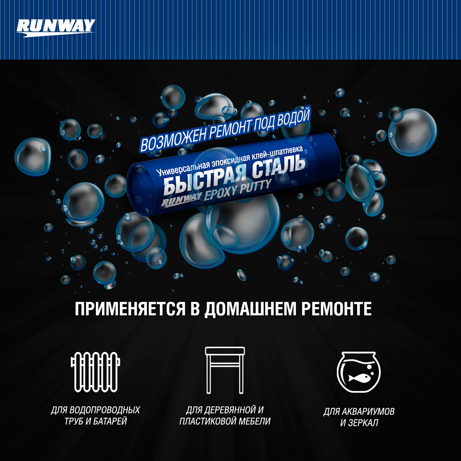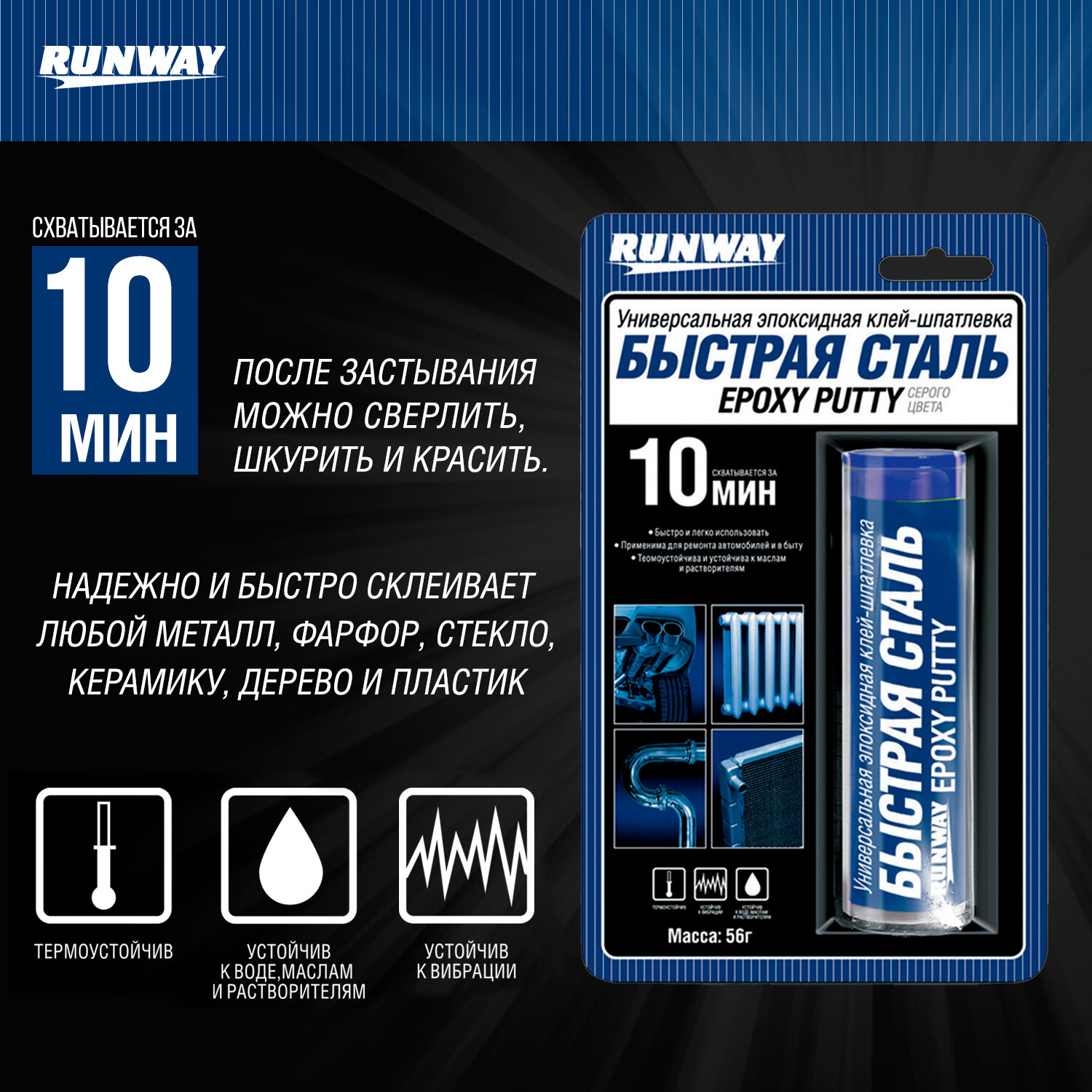 Универсальная эпоксидная Клей-Шпатлевка «Быстрая Сталь», 56г / клей для металла, фарфора, стекла, дерева, пластика/ RUNWAY / RW8505 информация: