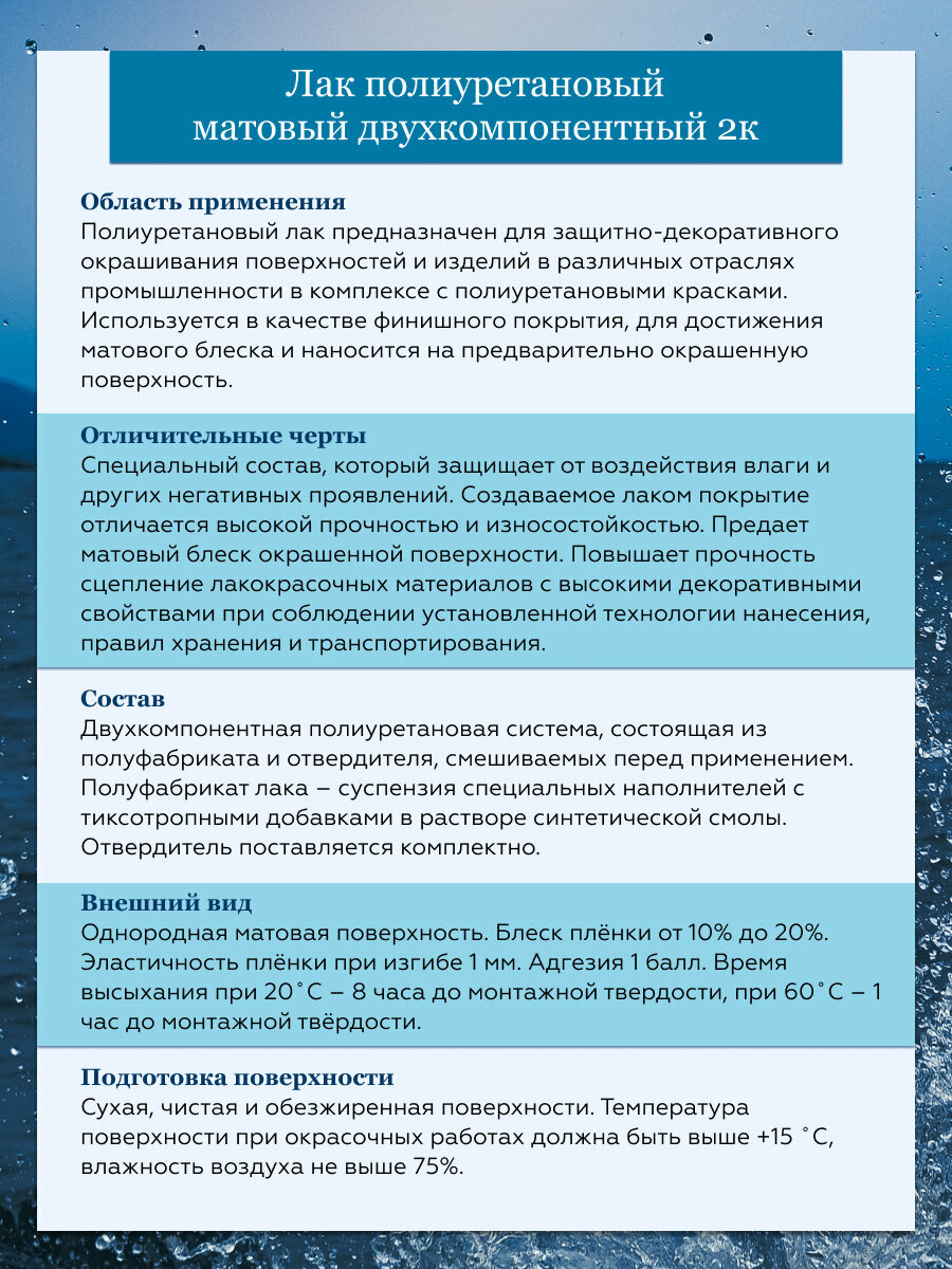 Полиуретановый матовый двухкомпонентный лак для наружных и внутренних работ Polimer Marine 5 кг информация: