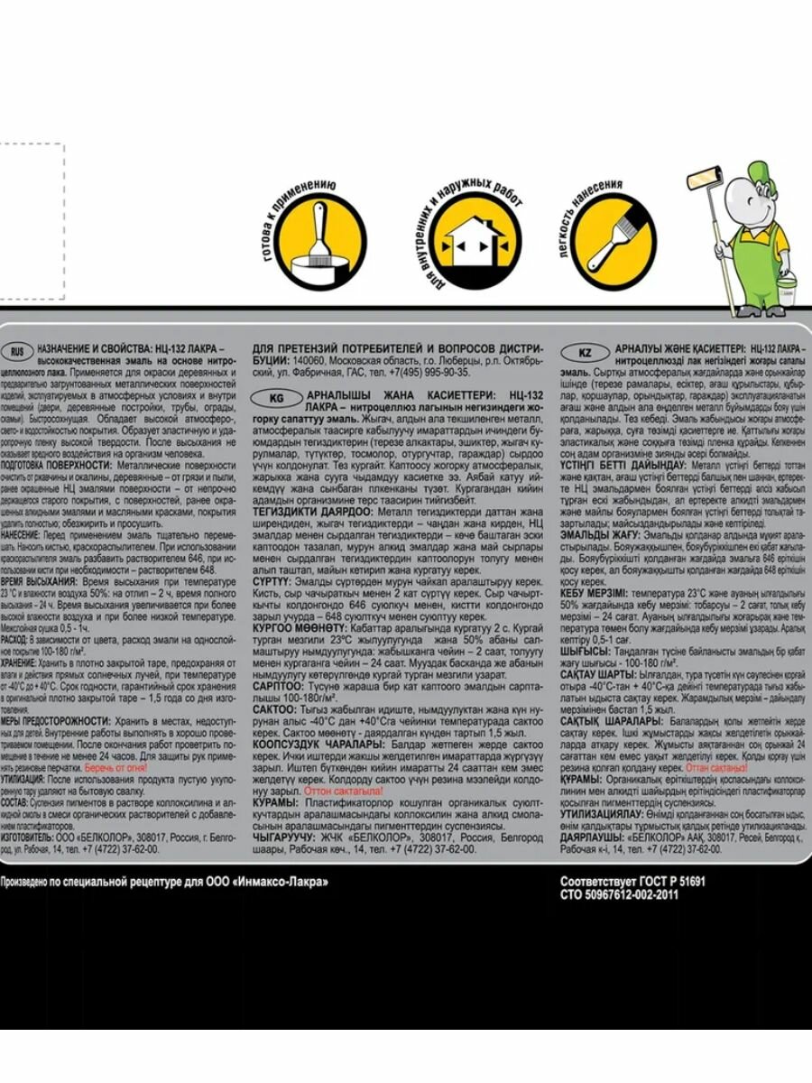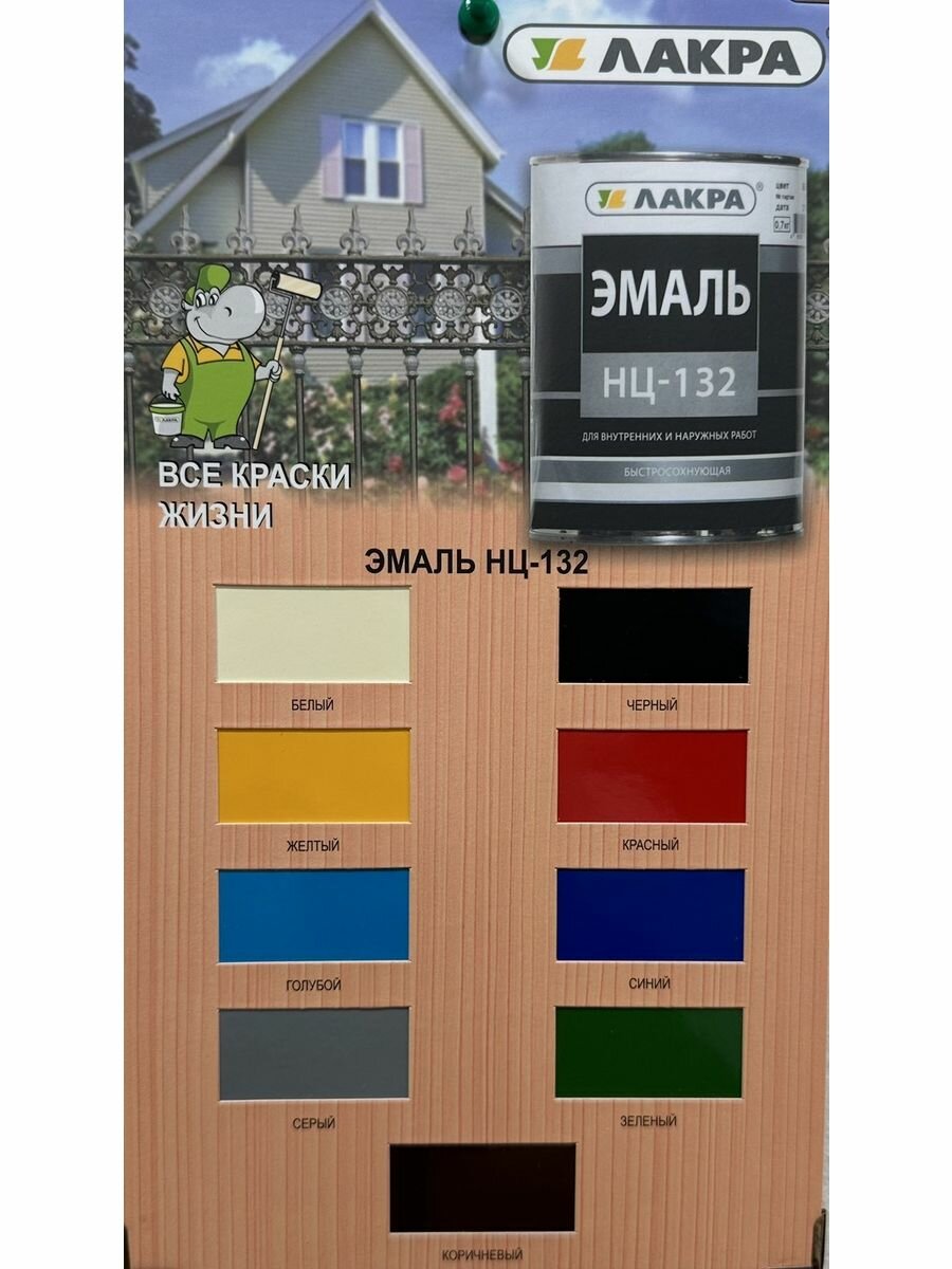 | Дополнительная информация | Эмаль НЦ-132 ЛАКРА предназначена для окраски металлических, деревянных поверхностей. Обладает высокой атмосферо/водостойкостью, рекомендуется для отделки поверхностей с повышенной влажностью. Образует гладкую эластичную поверхность, не трескается, быстро сохнет. Предназначена для защитно-декоративной окраски фасадов зданий и сооружений, а также для антикоррозионной защиты металлических поверхностей. Эмаль ЛАКРА это высококачественная эмаль на основе нитроцеллюлозного лака. После высыхания не оказывает вредного воздействия на организм человека. |