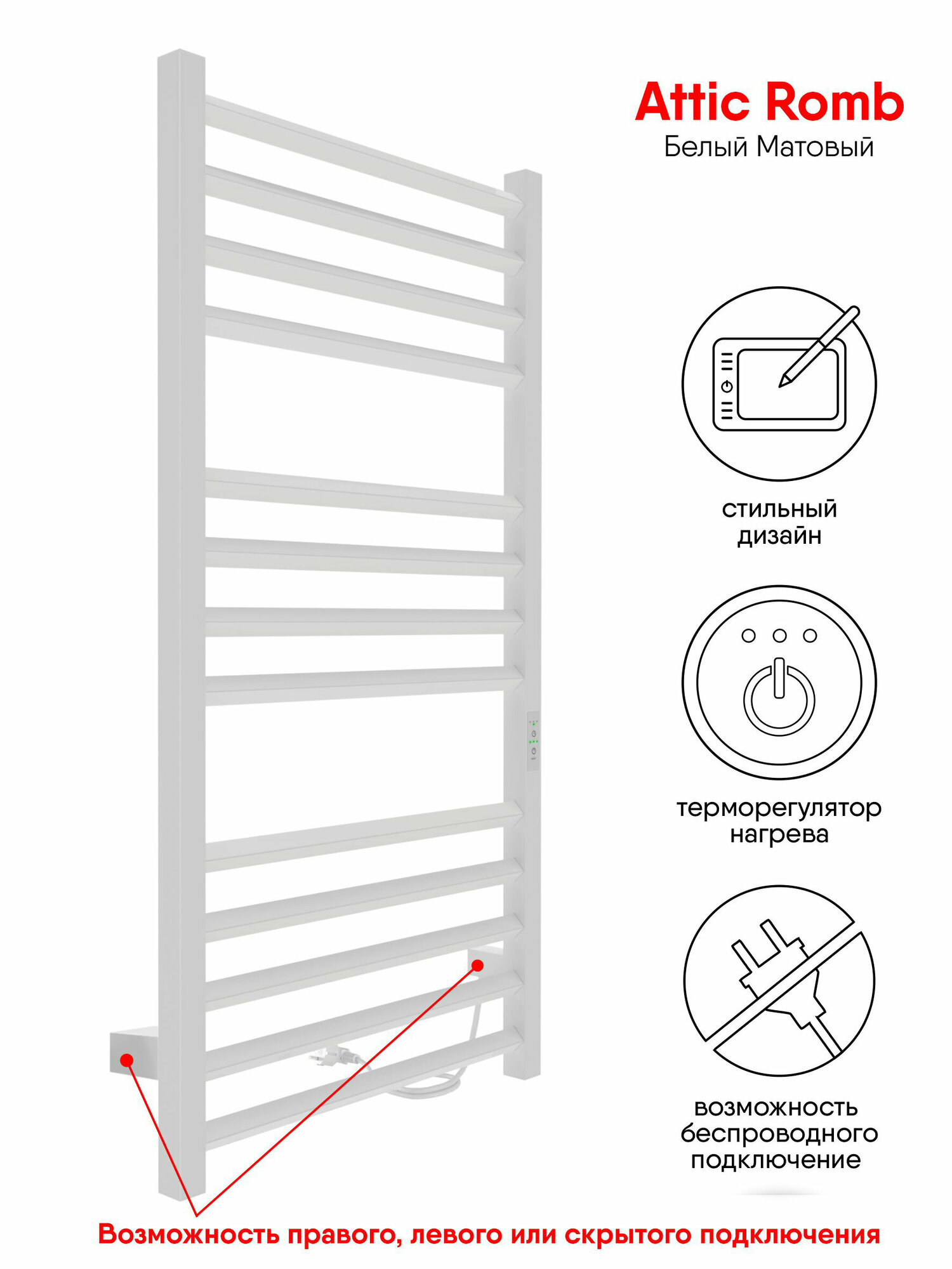 Полотенцесушитель электрический INDIGO Attic Romb 100/50 таймер, скрытый монтаж, универсальное подключение, Белый матовый информация: