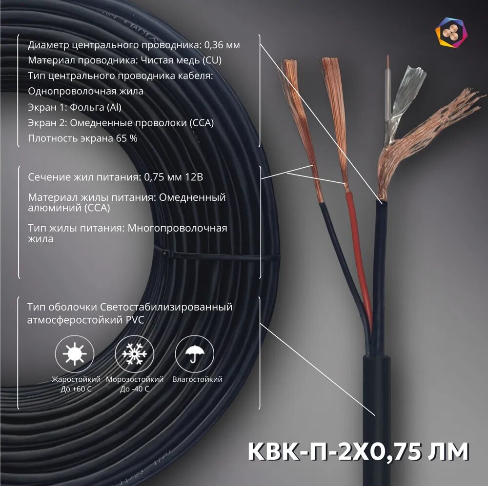 Кабель КВК для видеонаблюдения уличный 0,75мм ЛМ, 100 метров информация: