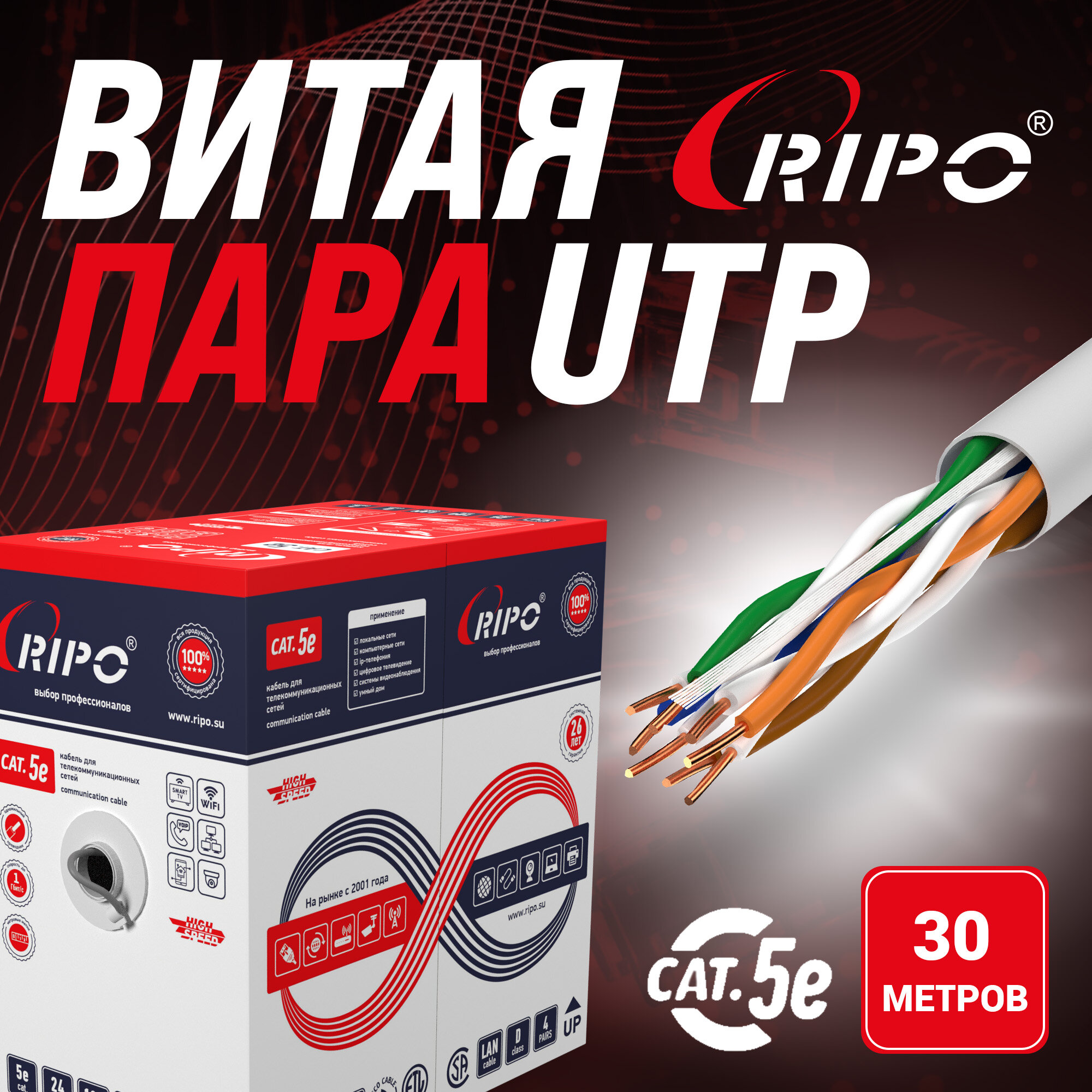 10 цен на Витая пара, интернет кабель, провод для роутера WiFi алюмомедь внутренний LAN UTP4 CAT5E 24AWG CCA RIPO 30 метров 001-112002/30