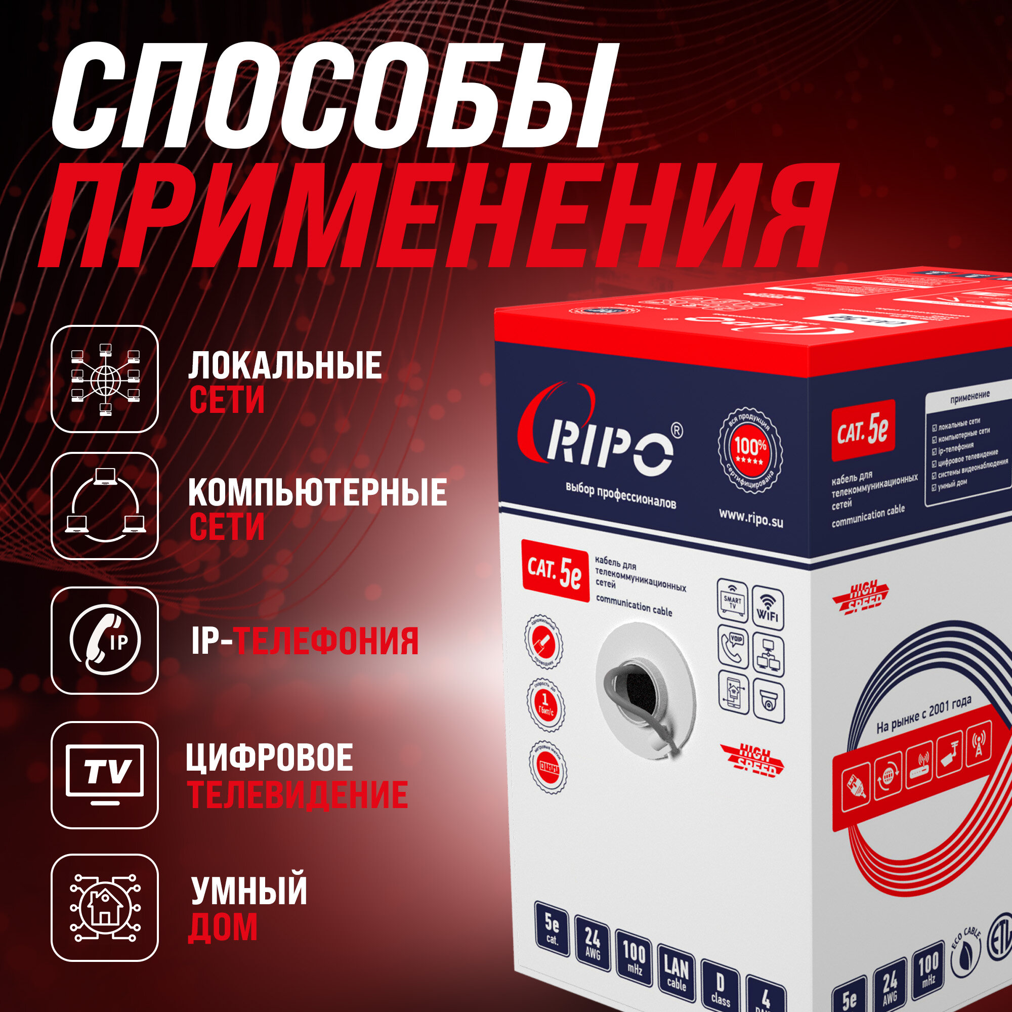 10 цен на Витая пара, интернет кабель, провод для роутера WiFi алюмомедь внутренний LAN UTP4 CAT5E 24AWG CCA RIPO 305 метров 001-112002