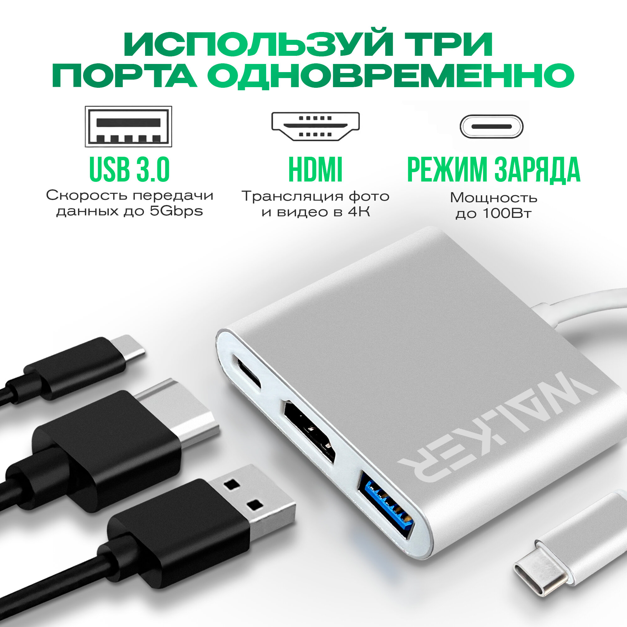 10 цен на Разветвитель USB HUB, WALKER, WHUB-35, 3в1, HDMI, USB 3.0, Type C на MacBook, хаб usb typec, юсб хаб для ноутбука, satechi hub на макбук, серебряный