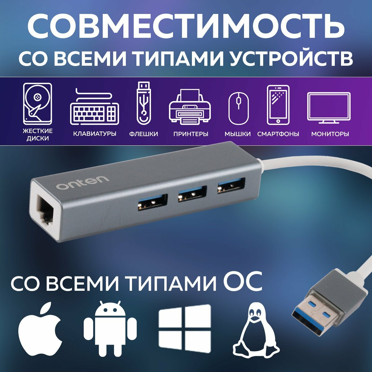 10 цен на Компактный USB-хаб Onten OTN-5226 (4-в-1) с Ethernet адаптером и 3 портами USB 2.0